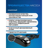 Корпус из высокопрочного пластика защищает механизмы насоса для лодок ПВХ от повреждений при ударах, а сумка из водонепроницаемой ткани – от загрязнения, влаги, образования потертостей, царапин и сколов на корпусе при транспортировке, хранении.