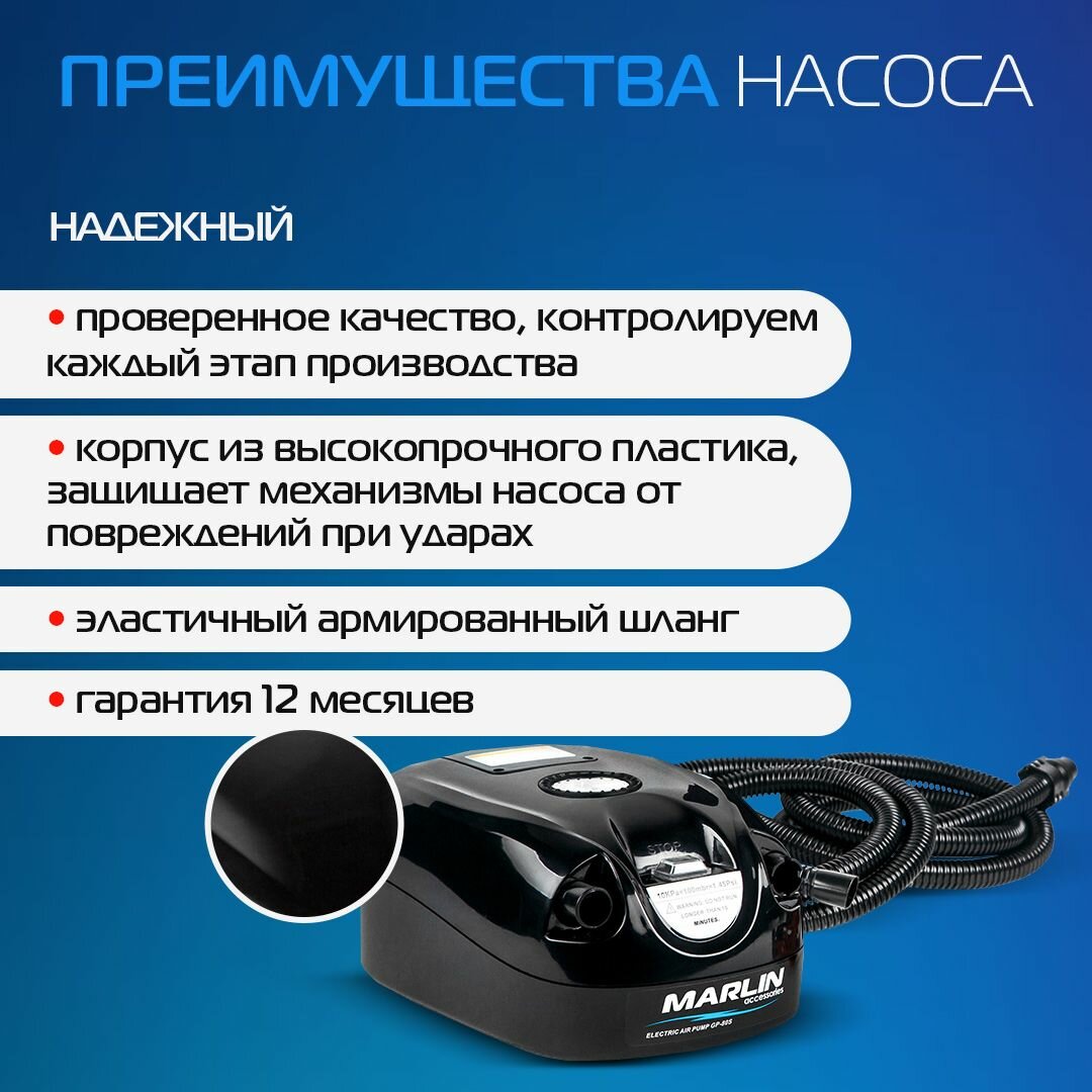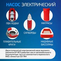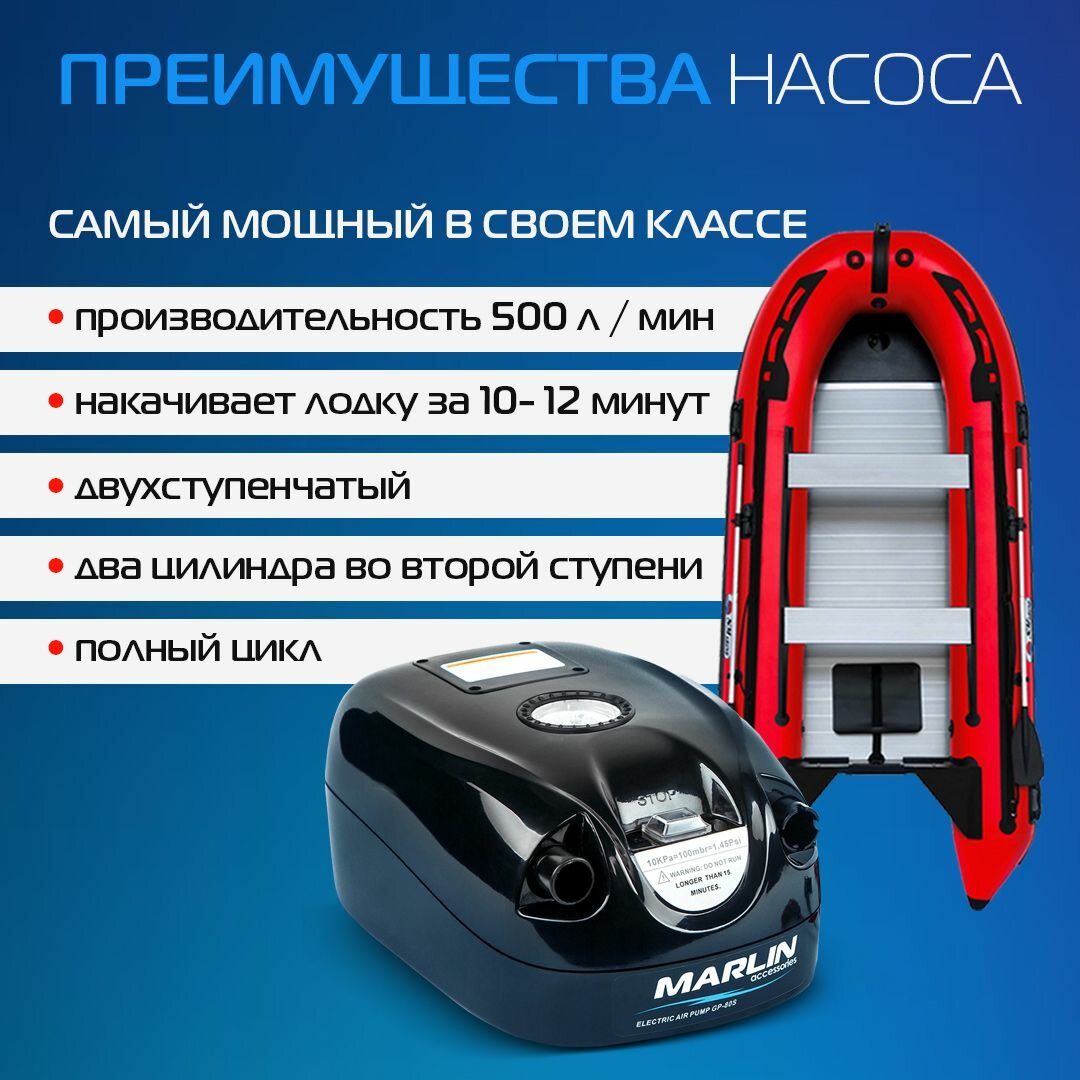 Двухступенчатый электрический насос высокого давления Marlin GP-80 S (ручное переключение с первой ступени на вторую) подходит для накачивания/сдувания надувных лодок ПВХ, РИБов, бассейнов, матрасов, аттракционов (в комплекте поставки имеется адаптер под вворачиваемый клапан и 9 переходников под воздушные клапаны различных диаметров).