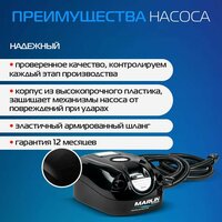 Насос работает как от автомобильного аккумулятора, так и от компактного переносного АКБ с ёмкостью 12V 7AH. Производительность – 500 л/мин, вес насоса – 3 кг.