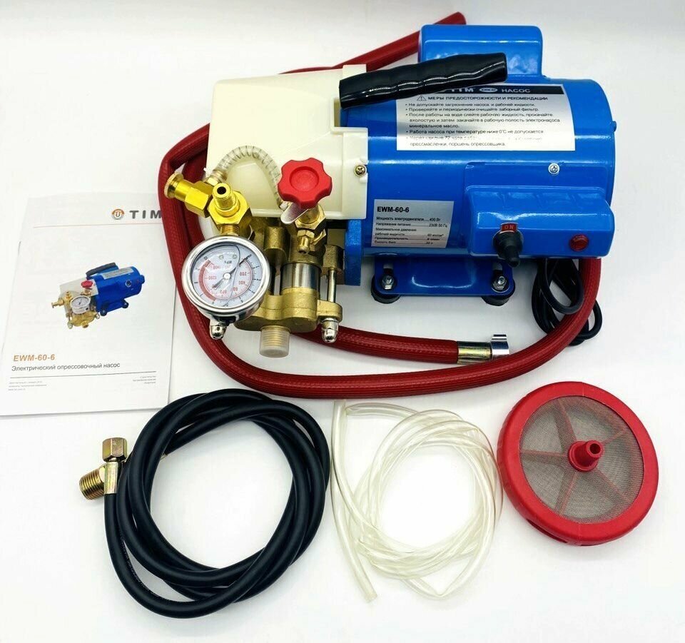 TIM EWM-60-6 – это опрессовочный насос с электрическим приводом специально разработанный для гидроиспытаний ёмкостей, проверки герметичности магистралей, трубопроводов, водопровода, сантехники, систем пожаротушения и отопления, технологического оборудования, паровых котлов и многих других применений, идеален для добавления рабочей среды в закрытые контуры. В качестве резервуара объёмом 17 литров используется пластиковый контейнер устойчивый к воздействию разнообразных жидкостей, в котором прибор поставляется. Инструмент оборудован регулируемым редукционным клапаном, на выходе установлен заполненный манометр рассчитанный на 70 кгс/см2 (7 МПа) с хорошо читаемой шкалой для контроля создаваемого давления, устройством сброса по завершении работ и гибким РВД для подсоединения к испытуемому объекту.Фильтр грубой очистки для защиты от взвеси и крупных частиц. Электрический опрессовочный насос TIM EWM-60-3 является полным аналогом мегеон 98160.