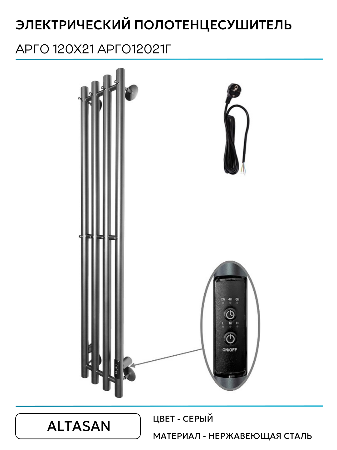 Купить Электрический полотенцесушитель Altasan Арго 120х21 Арго12021Г Графит нержавеющая сталь с доставкой по всей России.