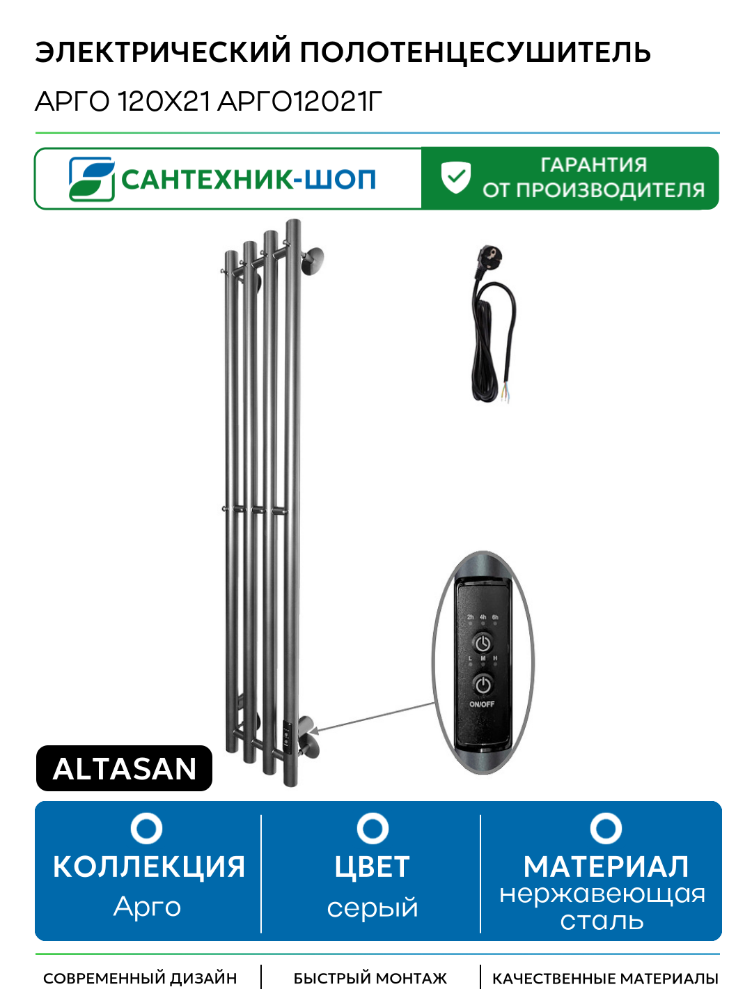 Купить Электрический полотенцесушитель Altasan Арго 120х21 Арго12021Г Графит нержавеющая сталь с доставкой по всей России.