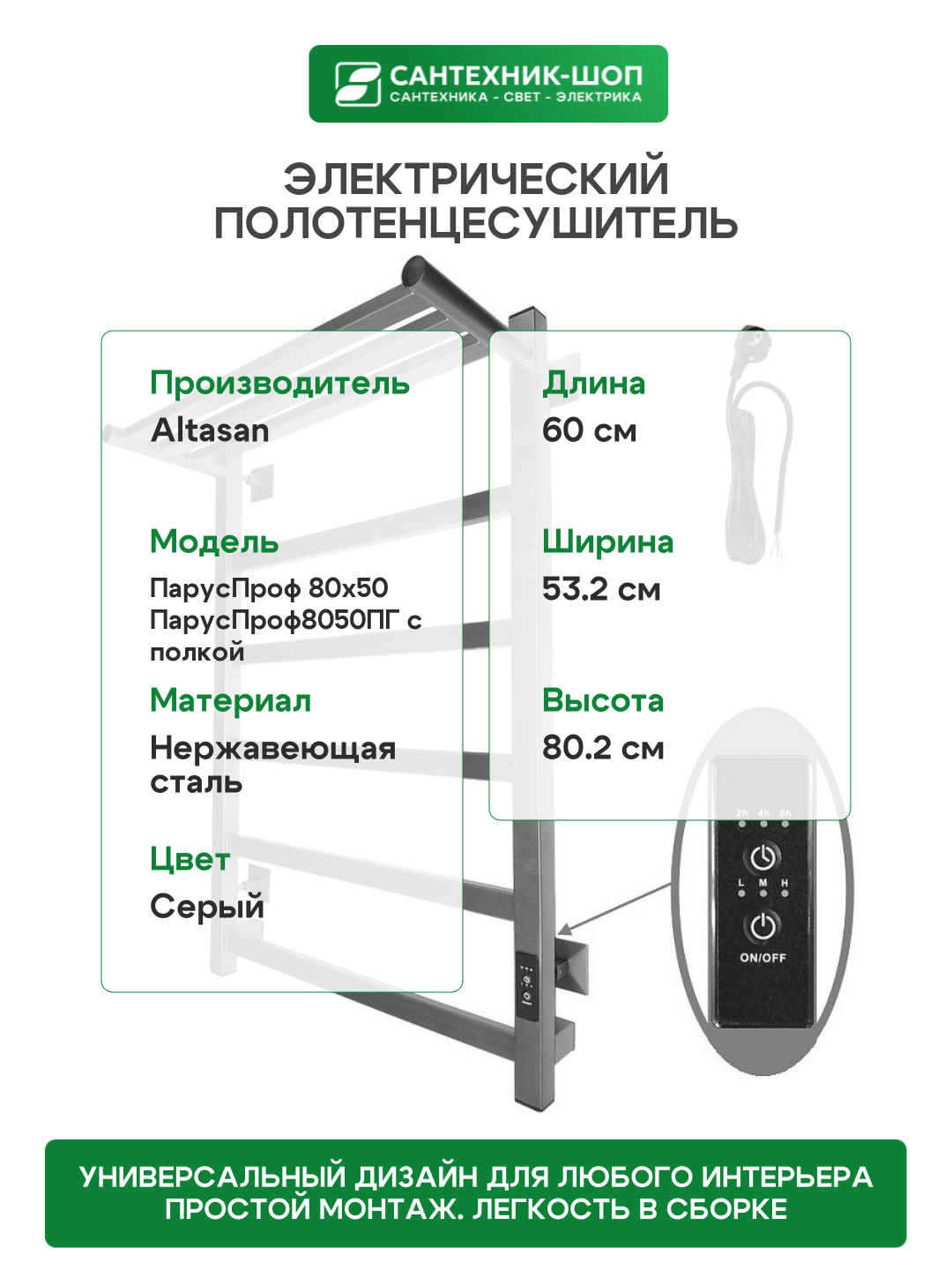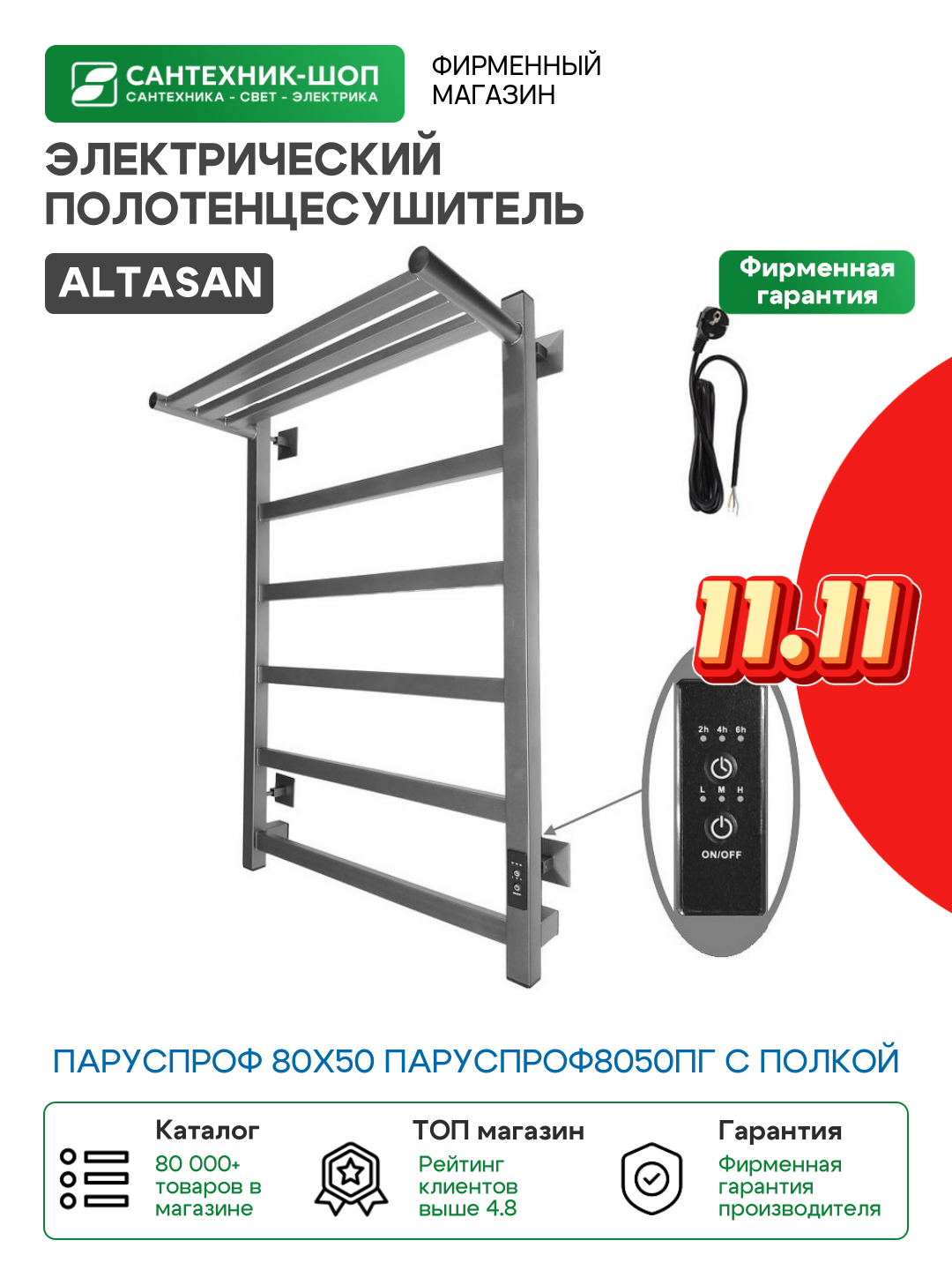 Электрический полотенцесушитель Altasan ПарусПроф 80х50 ПарусПроф8050ПГ с полкой Графит нержавеющая сталь: сравнение цен, характеристики, фото, актуальное наличие и цены.