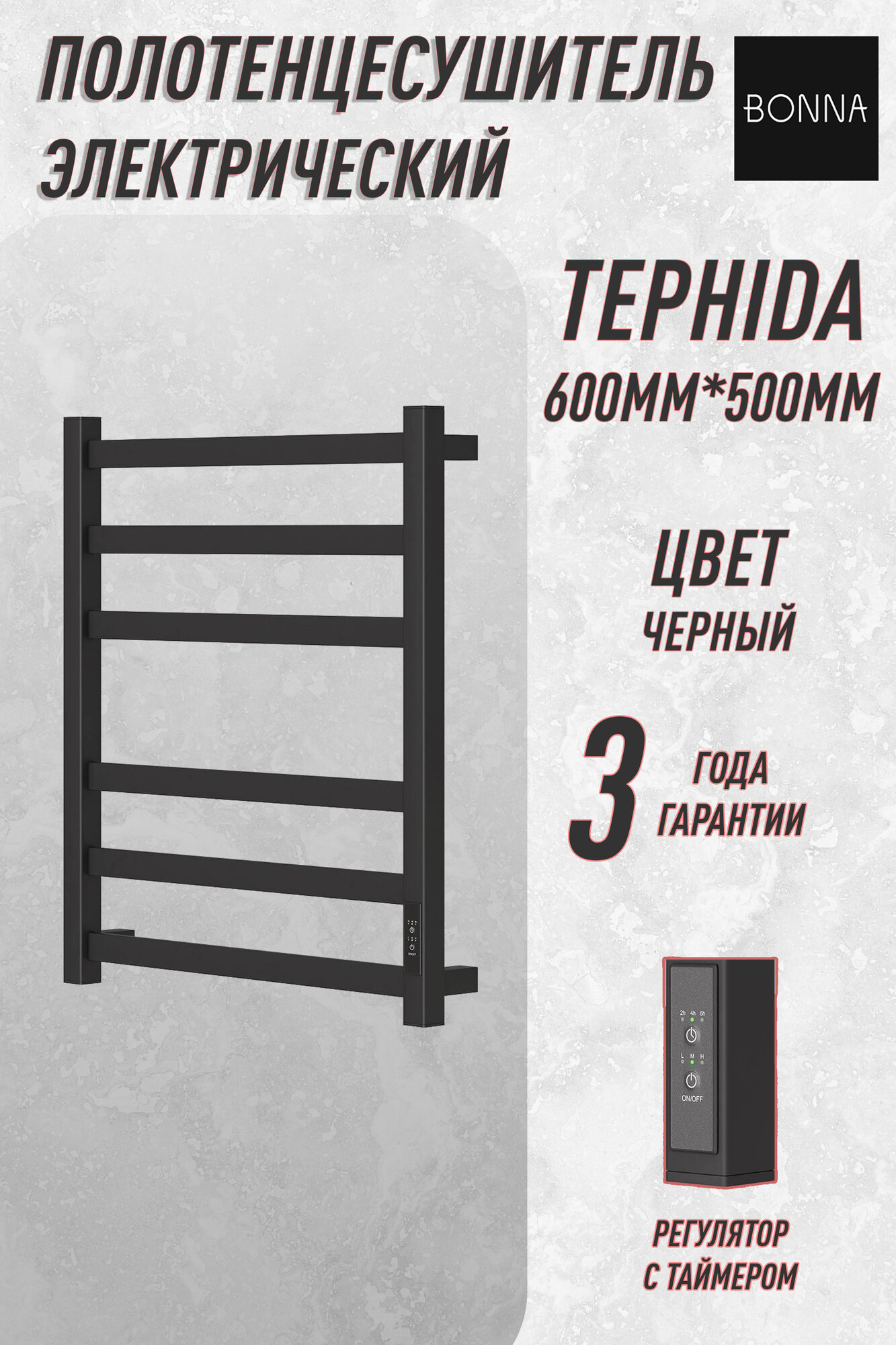 Купить Электрический полотенцесушитель Bonna Tephida, 600×500, Черный с доставкой по всей России. Электрический полотенцесушитель Bonna Tephida, 600×500, Черный: сравнение цен, характеристики, фото, актуальное наличие и цены.
