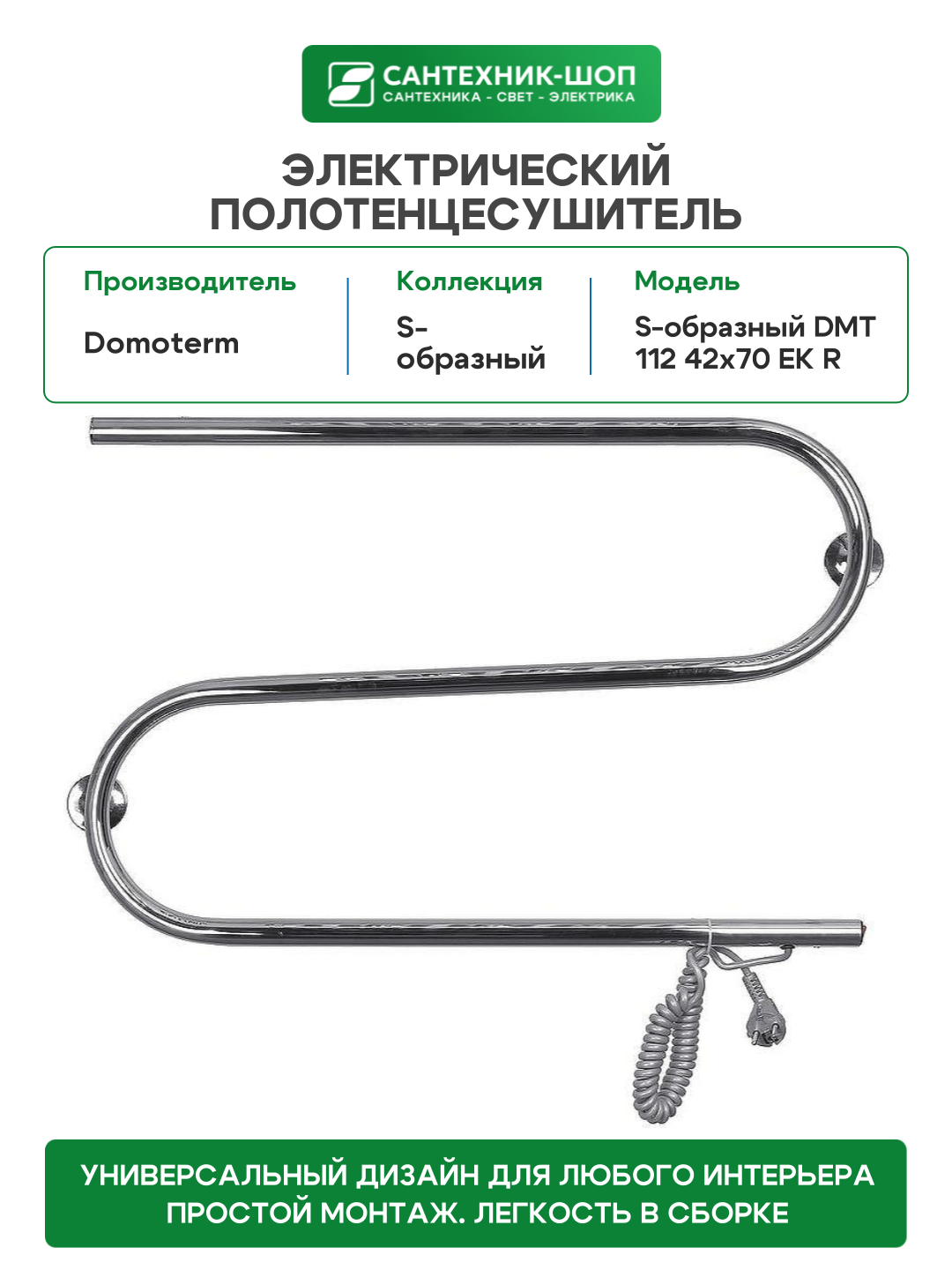 Купить Электрический полотенцесушитель Domoterm S-образный DMT 112 42×70 EK R Хром с доставкой по всей России. Электрический полотенцесушитель Domoterm S-образный DMT 112 42×70 EK R Хром: сравнение цен, характеристики, фото, актуальное наличие и цены.