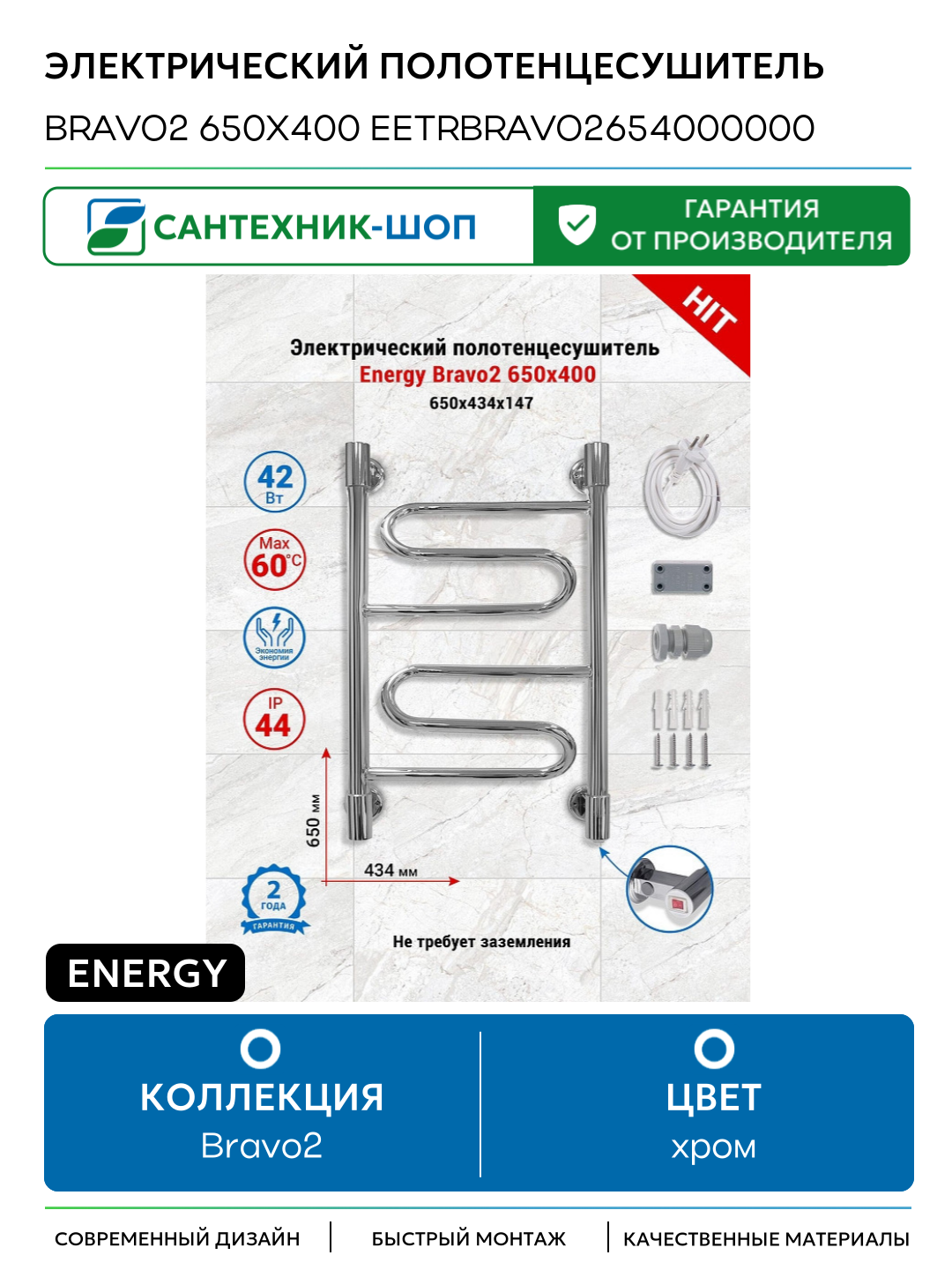 Электрический полотенцесушитель Energy Bravo2 650х400 EETRBRAVO2654000000 цвет Хром: сравнение цен, характеристики, фото, актуальное наличие и цены.