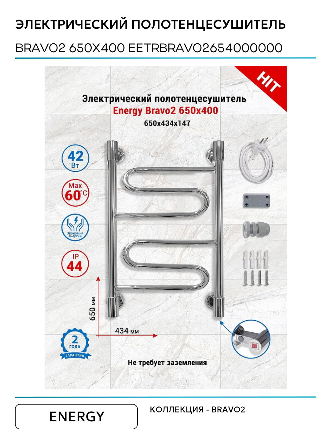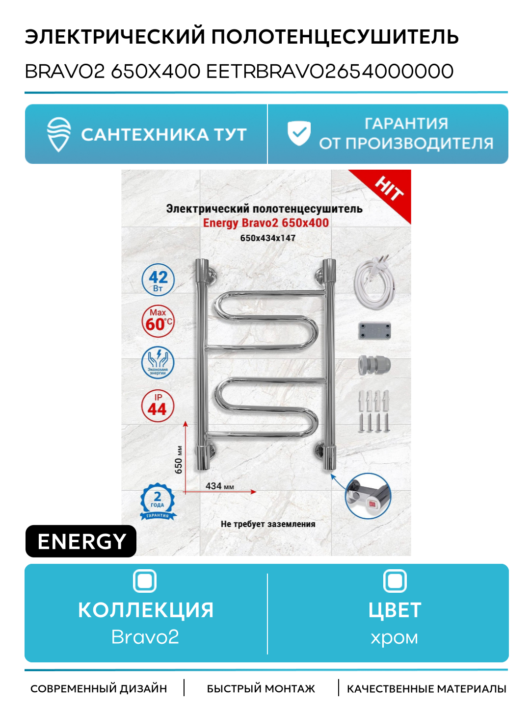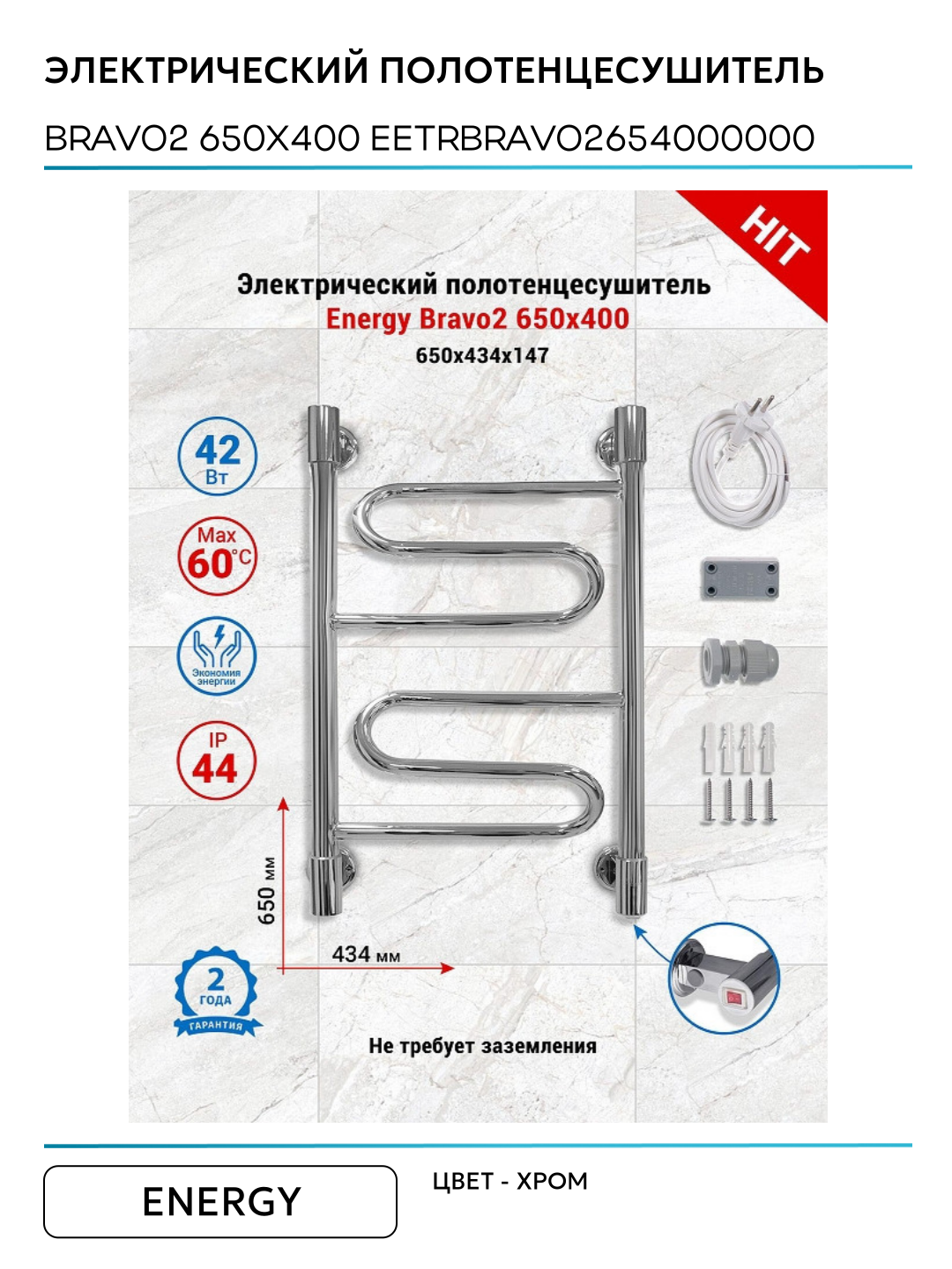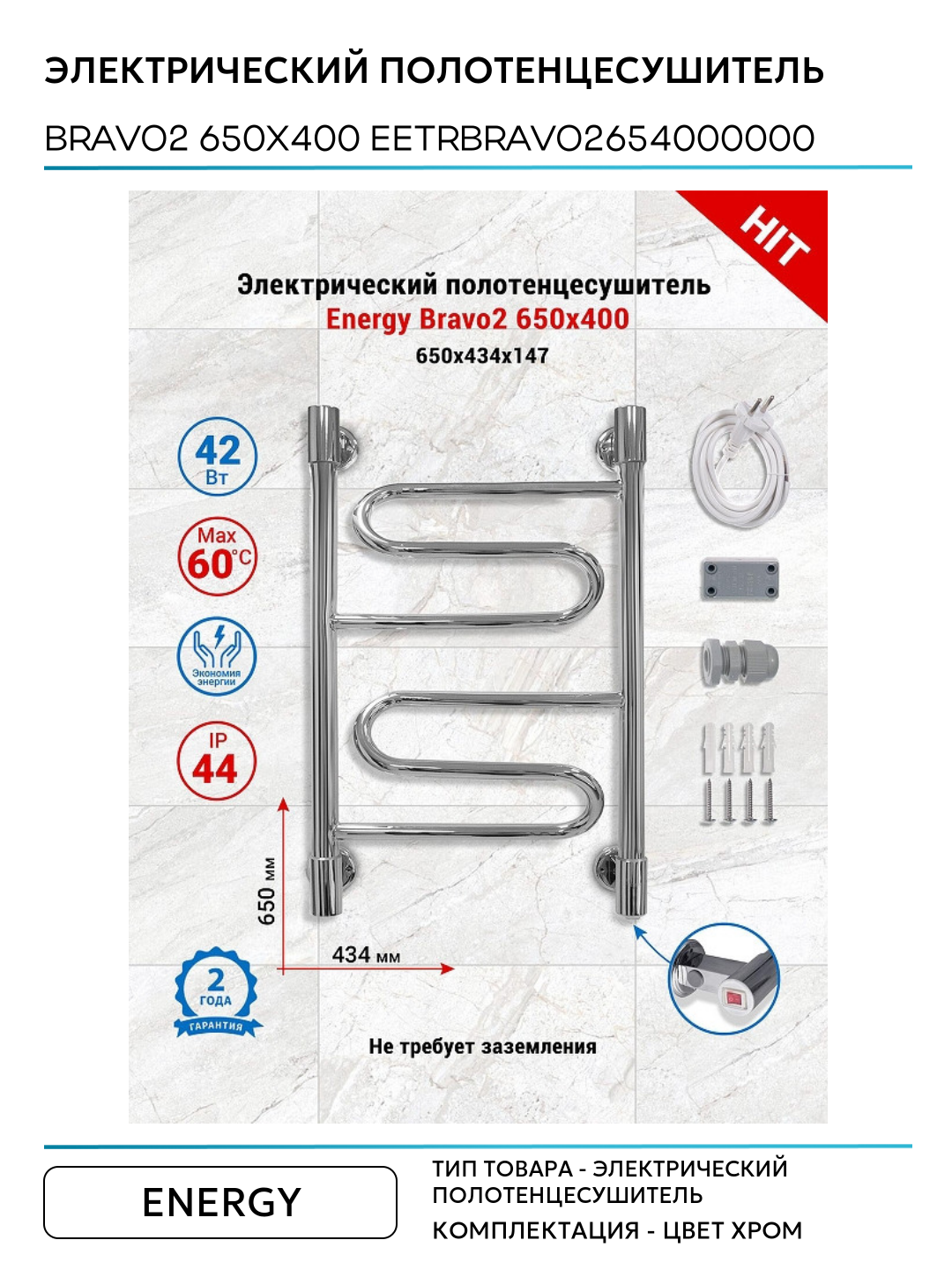 Электрический полотенцесушитель Energy Bravo2 650х400 EETRBRAVO2654000000 цвет Хром: сравнение цен, характеристики, фото, актуальное наличие и цены.