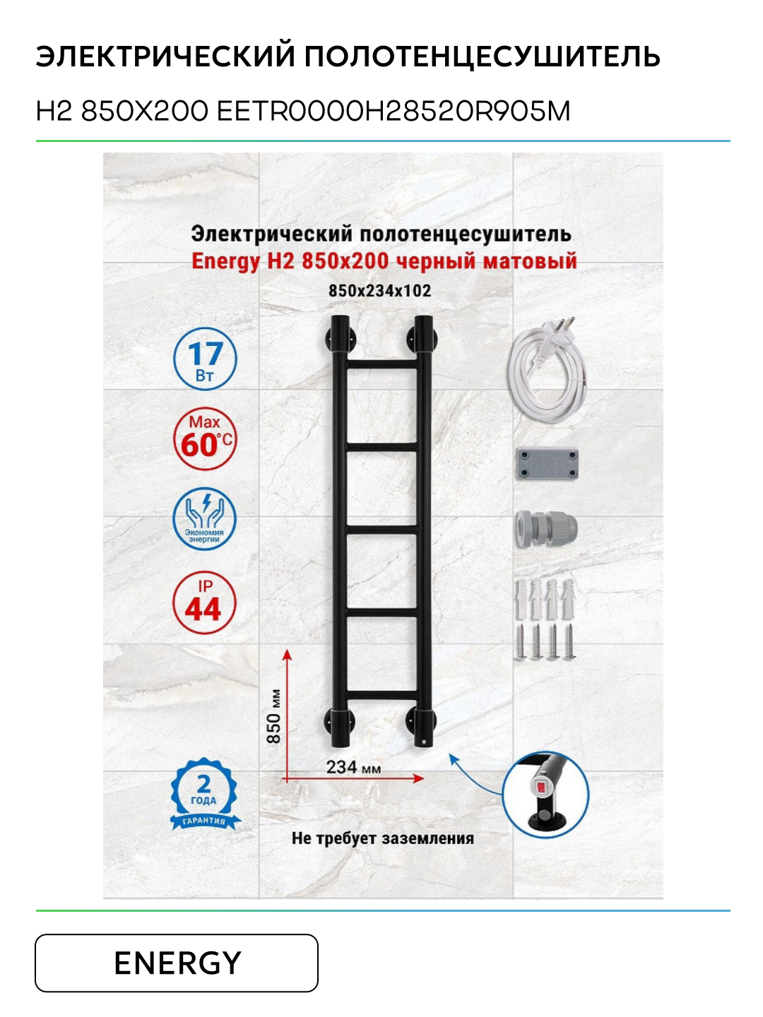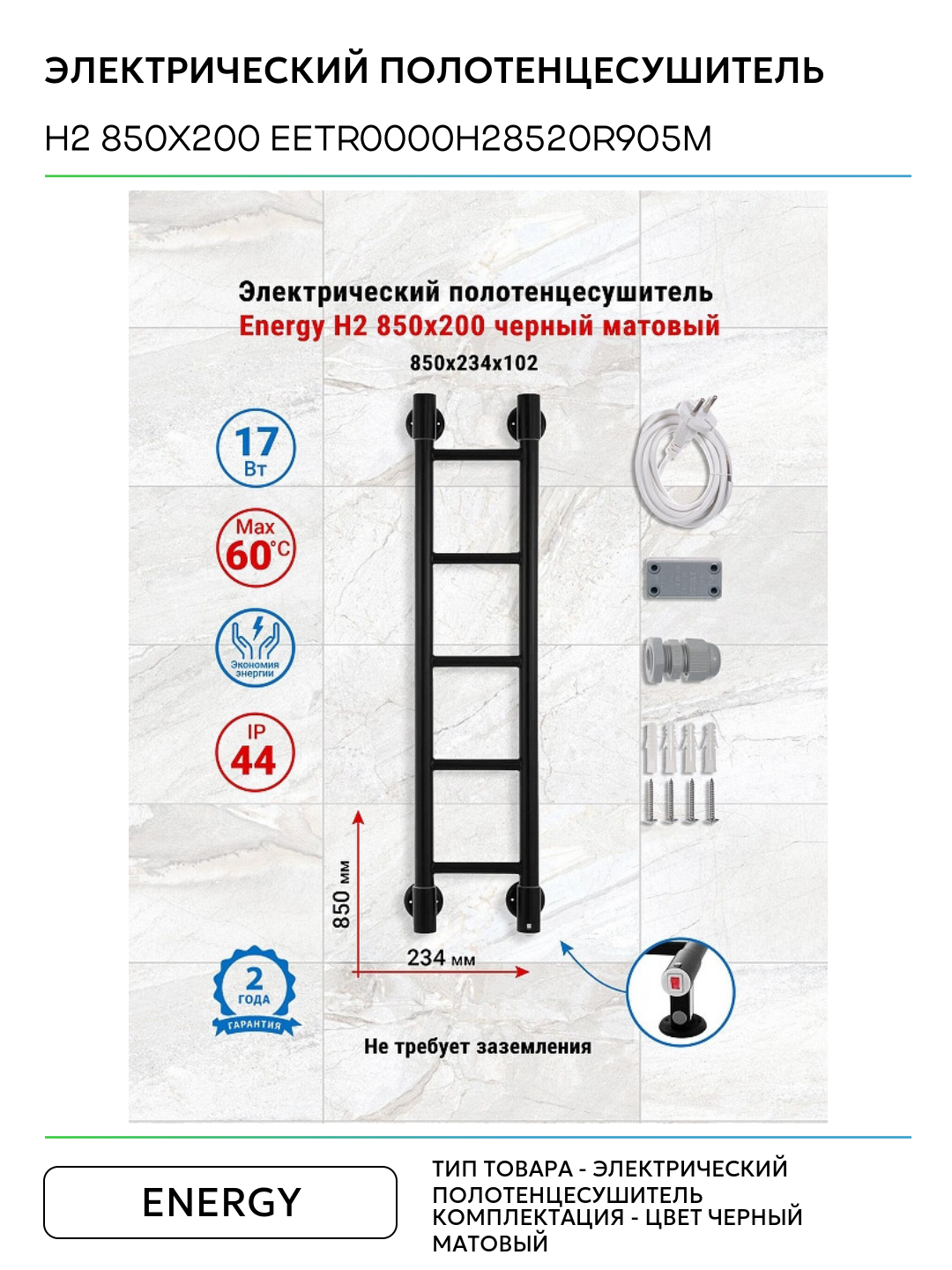 Купить Электрический полотенцесушитель Energy H2 850х200 EETR0000H28520R905M цвет Черный матовый с доставкой по всей России.