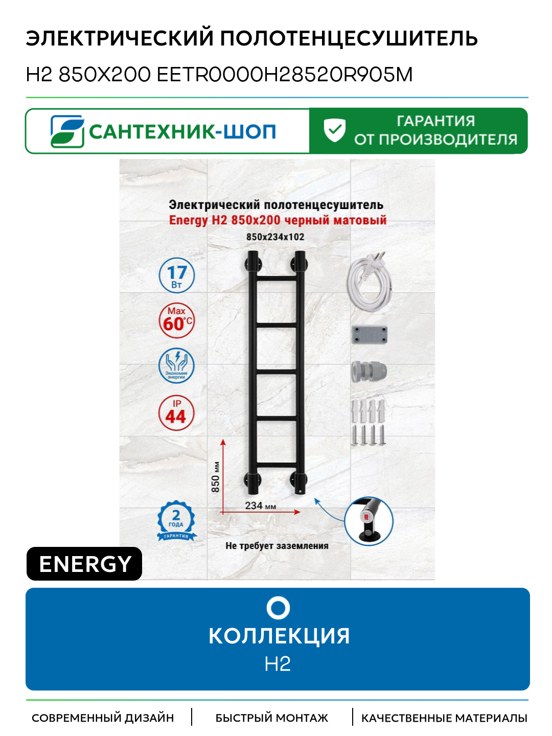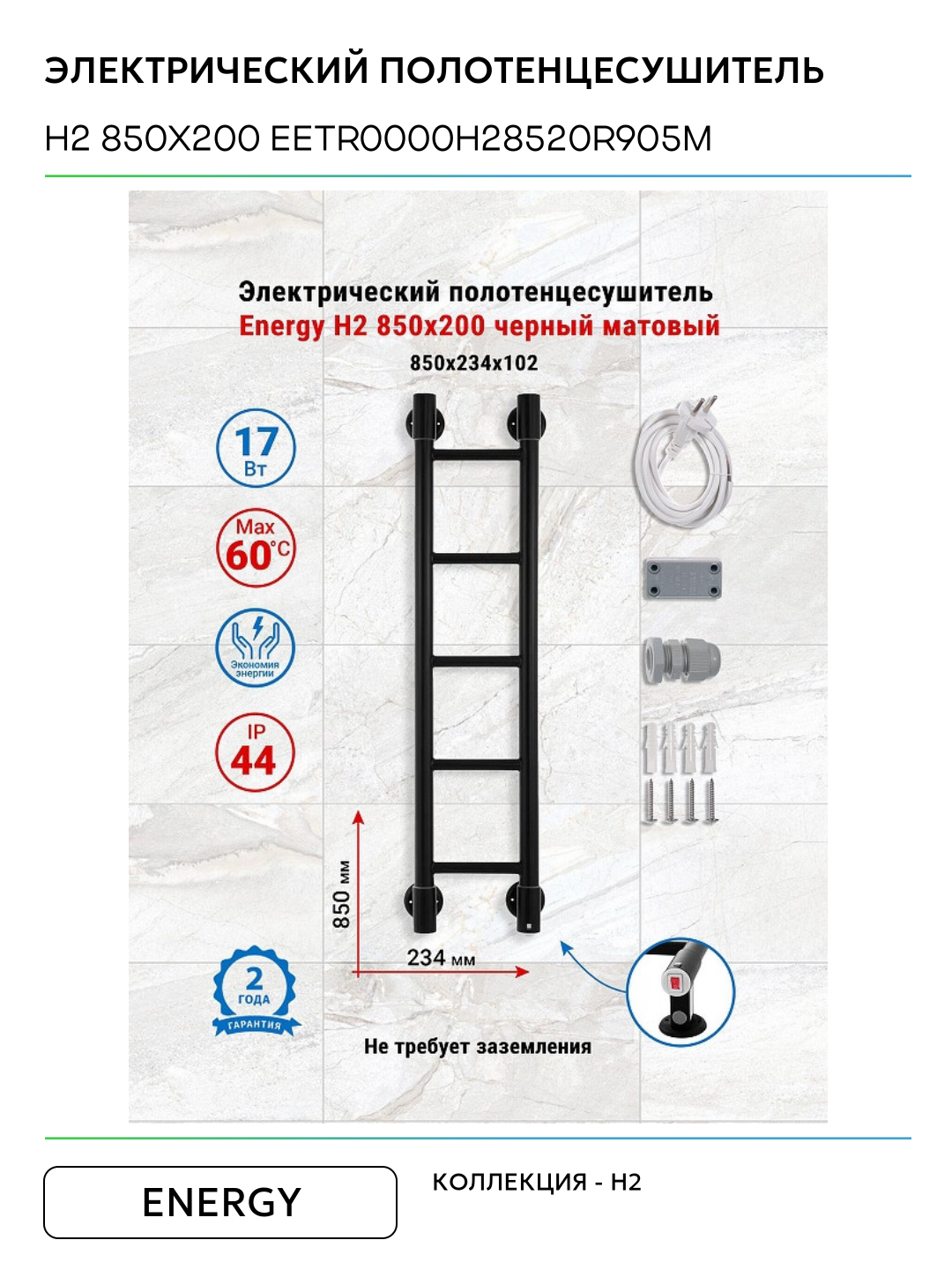 Электрический полотенцесушитель Energy H2 850х200 EETR0000H28520R905M цвет Черный матовый: сравнение цен, характеристики, фото, актуальное наличие и цены.