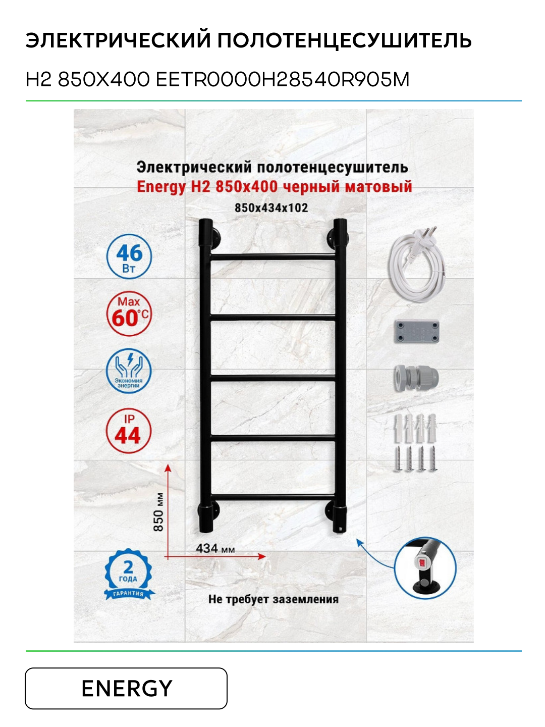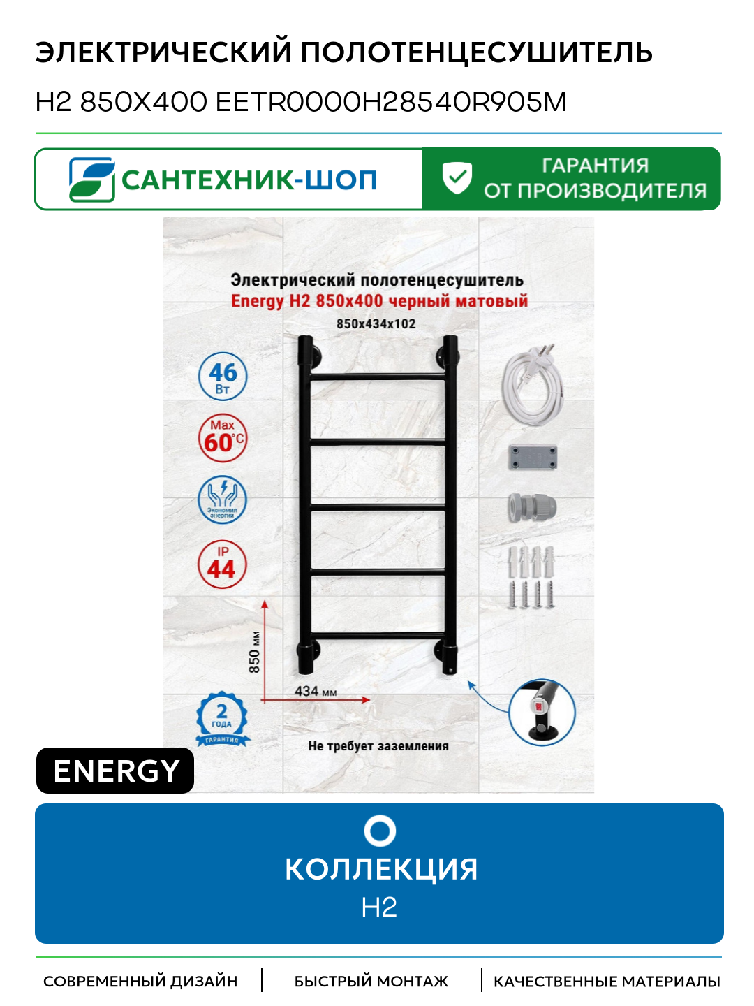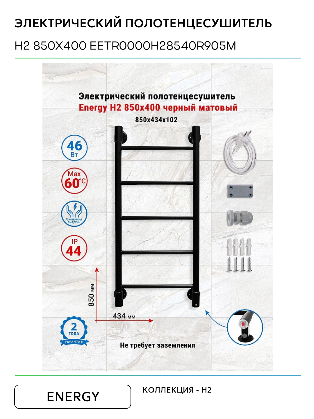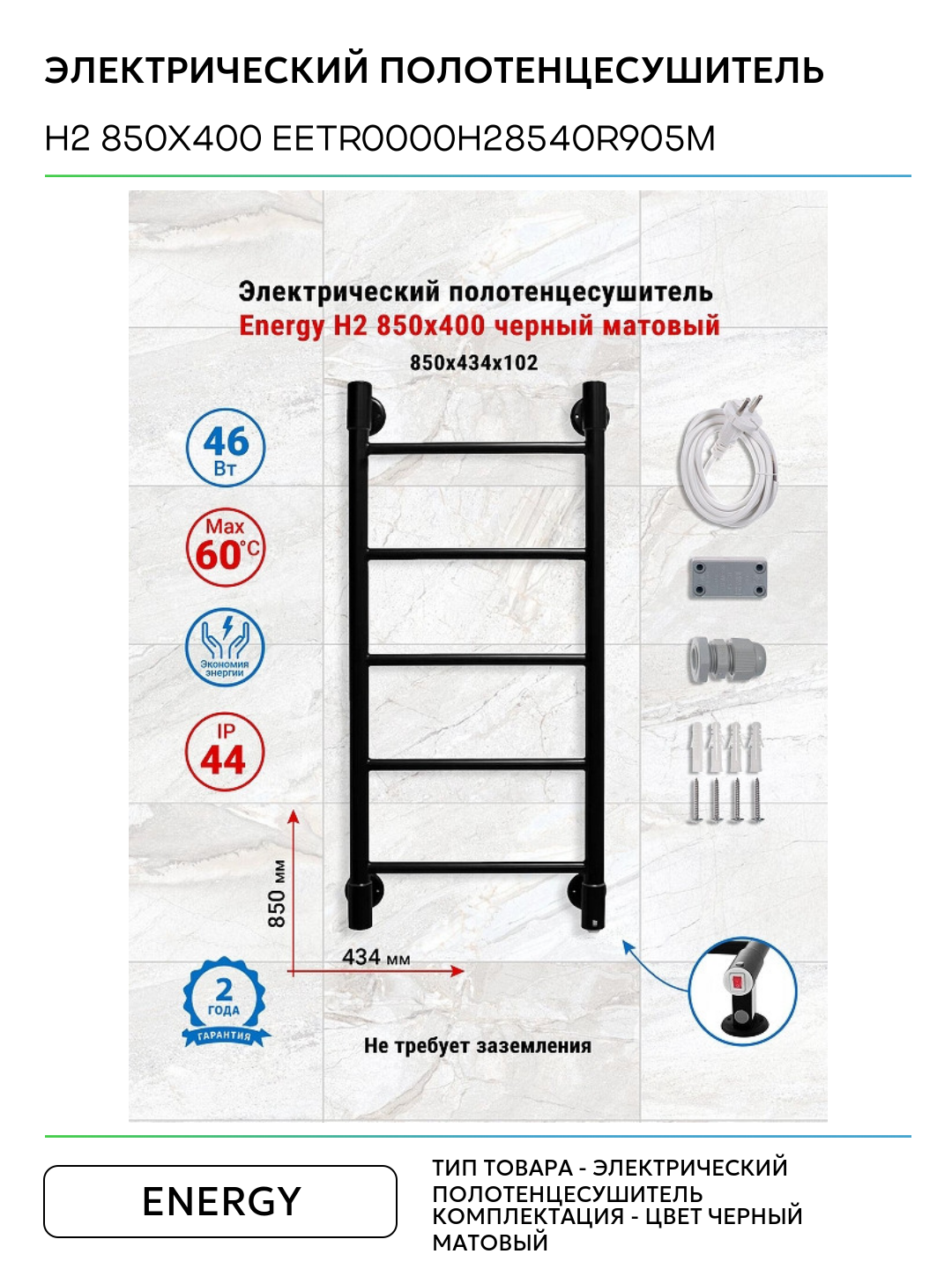 Электрический полотенцесушитель Energy H2 850х400 EETR0000H28540R905M цвет Черный матовый: сравнение цен, характеристики, фото, актуальное наличие и цены.