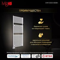 Электрические полотенцесушители iVigo идеально подходят для эксплуатации в помещениях с повышенной влажностью – в ванной комнате и/или кухне, благодаря их функциональности и элегантному дизайну. Они являются автономным электрическими приборами, которые не зависят от системы центрального отопления и могут использоваться круглогодично. Полотенцесушители iVigo помогут не только нагреть ванную комнату, но и отлично справятся с сушкой белья, одежды и других текстильных изделий, не повреждая ткань. Цифровой полотенцесушитель iVigo EHR 5033 800W белого цвета позволяет нагреть помещение до 10 м2. Электронная панель имеет 3 настройки температуры (min, eco, max). Режим Eco обеспечивает идеальный баланс тепла и энергоэффективности. Конструкция снабжена антифризом – специальная жидкость внутри полотенцесушителя, которая обеспечивает защиту от замерзания при наружной температуре до -15C. Полотенцесушитель может быть легко установлен даже в ограниченном пространстве. Поскольку для его работы не требуется подключение к водопроводу, его можно просто закрепить на стене с помощью прилагаемого комплекта и подключить к розетке без каких-либо ремонтных изменений в ванной комнате. Преимущества: Гарантия 5 лет.