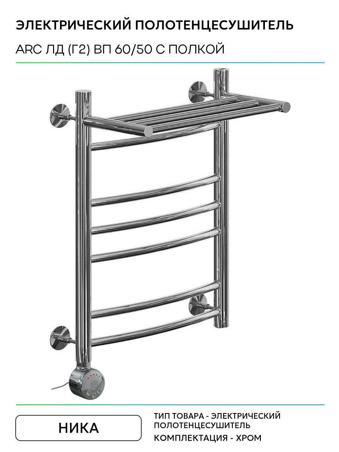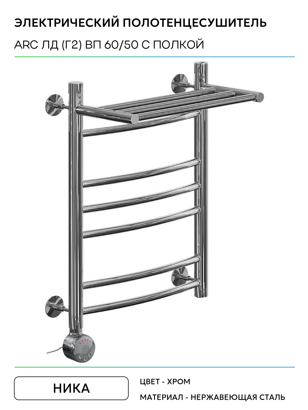 Электрический полотенцесушитель Ника Arc ЛД (Г2) ВП 60/50 с полкой Хром нержавеющая сталь: сравнение цен, характеристики, фото, актуальное наличие и цены.