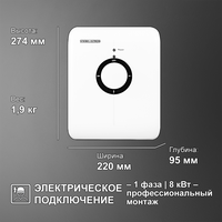 общая мощность нагревательных элементов: 8 кВт; мин. давление воды: 1 атм; макс. давление воды: 10 атм; ограничение температуры нагрева; тип электрического нагревательного элемента: трубчатый; материал нагревательного элемента: медь; степень защиты от воды: 5; управление проточным электрическим водонагревателем: гидравлическое