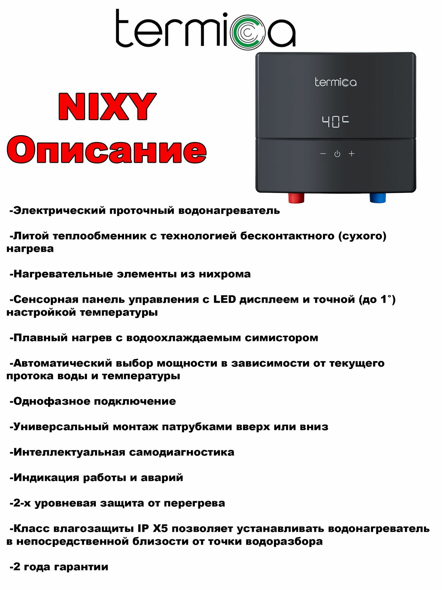 Купить Электрический проточный водонагреватель termica NIXY, 5,5 кВт, надёжный с доставкой по всей России. Электрический проточный водонагреватель termica NIXY, 5,5 кВт, надёжный: сравнение цен, характеристики, фото, актуальное наличие и цены.
