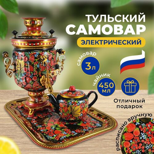 Электрический самовар хохлома «Клубника с незабудками», 3 литра, с чайником и подносом: сравнение цен, характеристики, фото, актуальное наличие и цены.