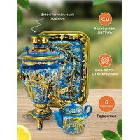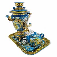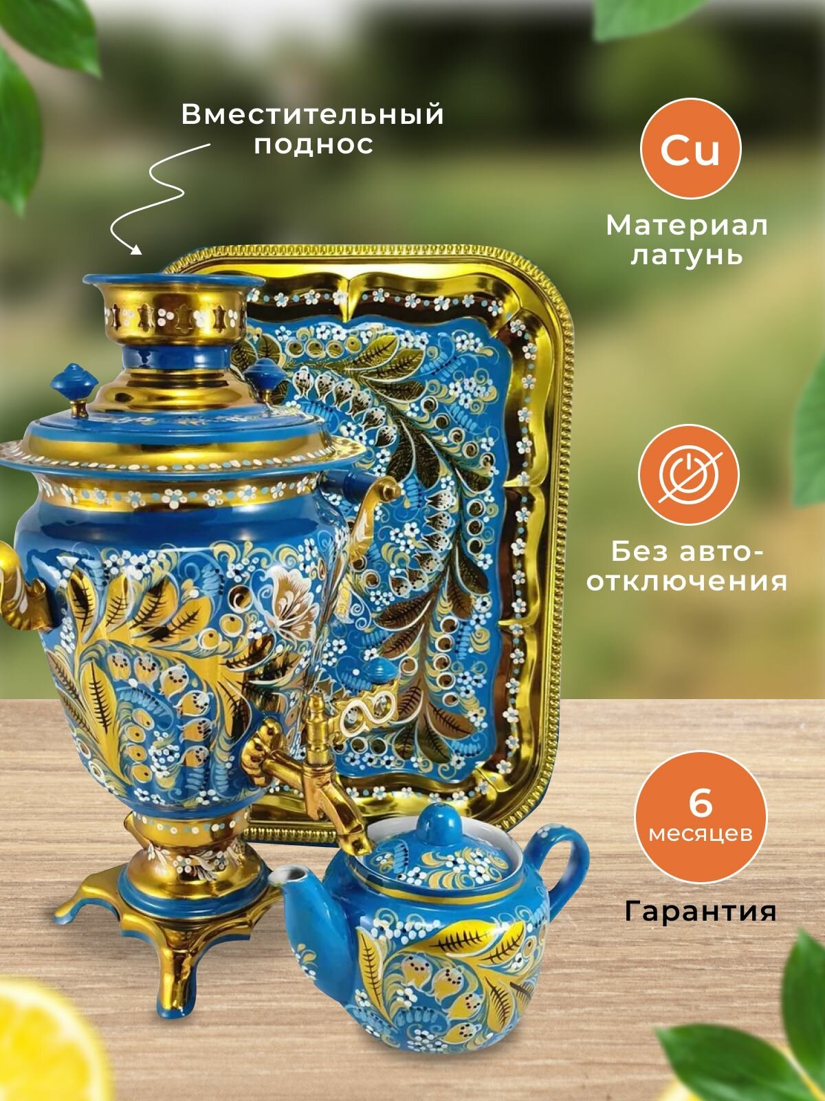 Тульский электрический самовар "Ландыши" синий, 3 литра (форма "Рюмка") – современное воплощение русских традицийИзысканный самовар с ручной росписью – символ гостеприимства и уютаПредставляем вашему вниманию уникальный тульский электрический самовар "Ландыши" в благородном синем цвете. Эта модель сочетает в себе вековые традиции тульских мастеров и современные технологии, создавая неповторимую атмосферу настоящего русского чаепития. Особенности и преимущества: Электрический самовар с чайником – быстро нагревает воду (до кипения за 15-20 минут)Объем 3 литра – идеально для семьи или дружеских посиделокФорма "Рюмка с гранями" – изысканный дизайн с удобной конструкциейКачественная латунь – прочность и долговечностьЖаростойкие пластиковые ручки – удобство использования без риска обжечьсяКомплект с подносом – завершенный ансамбль для эстетичного сервираТехнические характеристики:• Материал: латунь• Внутренняя обработка: пищевое покрытие• Мощность ТЭНа: 1 кВт• Толщина стенок: 1,5 мм (надежная теплоизоляция)• Размеры: 37 × 26 см• Вес: 2,5 кг• Гарантия: 6 месяцев• Страна производства: РоссияУникальные особенности: Ручная роспись "Ландыши" – каждый самовар уникаленСмягчающая защита ножек – не царапает поверхность столаЭргономичная форма – удобство в использованииСтильный синий цвет – прекрасно впишется в любой интерьерИдеальный подарок: Этот тульский электрический самовар с росписью станет прекрасным подарком:• На свадьбу или юбилей• Любителям русских традиций• Для украшения домашнего интерьера• Ценителям качественной посудыВарианты использования:• Самовар с конфетами – оригинальный сладкий подарок• Для ежедневного чаепития – создаст особую атмосферу• Как элемент интерьера – подчеркнет ваш вкусКомплектация: Электрический самоварКерамический чайникПодносПочему стоит выбрать именно этот самовар?• Проверенное качество от производителя • Долгий срок службы – гарантия 6 месяцев• Удобство в использовании – легкий (2,5 кг) и компактный• Элегантный дизайн – украсит любой столПодарите себе и своим близким настоящее русское чаепитие с этим великолепным электрическим самоваром тульского производства! Этот набор станет не только практичным приобретением, но и предметом гордости в вашем доме.