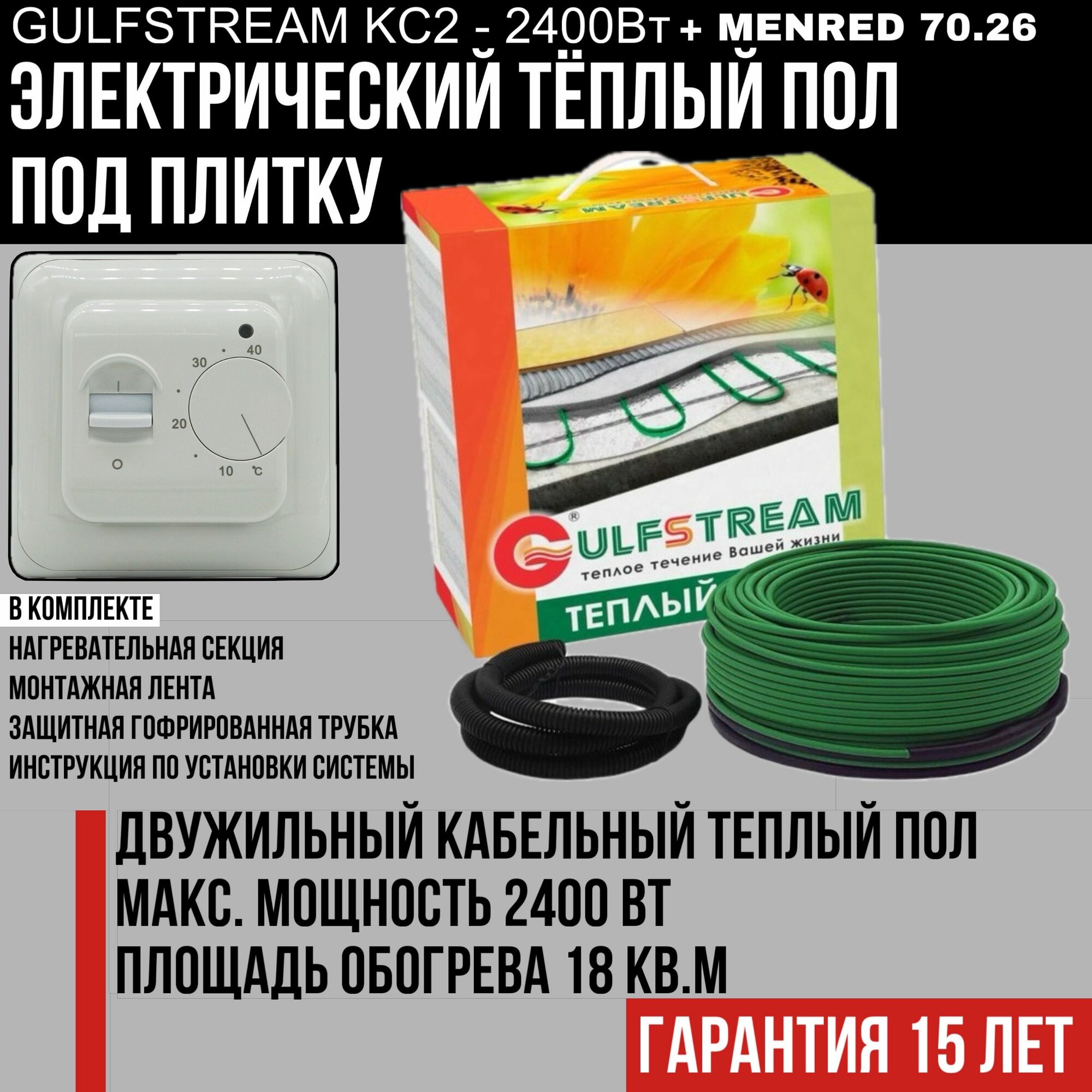 «Gulfstream КГС2 – это двужильный кабельный теплый пол, предназначенный для укладки в слой цементной стяжки. Он подходит для любых типов помещений (гостиных, спален, ванных и туалетных комнат, лоджий и т. п.) с любым типом используемого напольного покрытия (плитка, линолеум, ламинат и т. п.).»