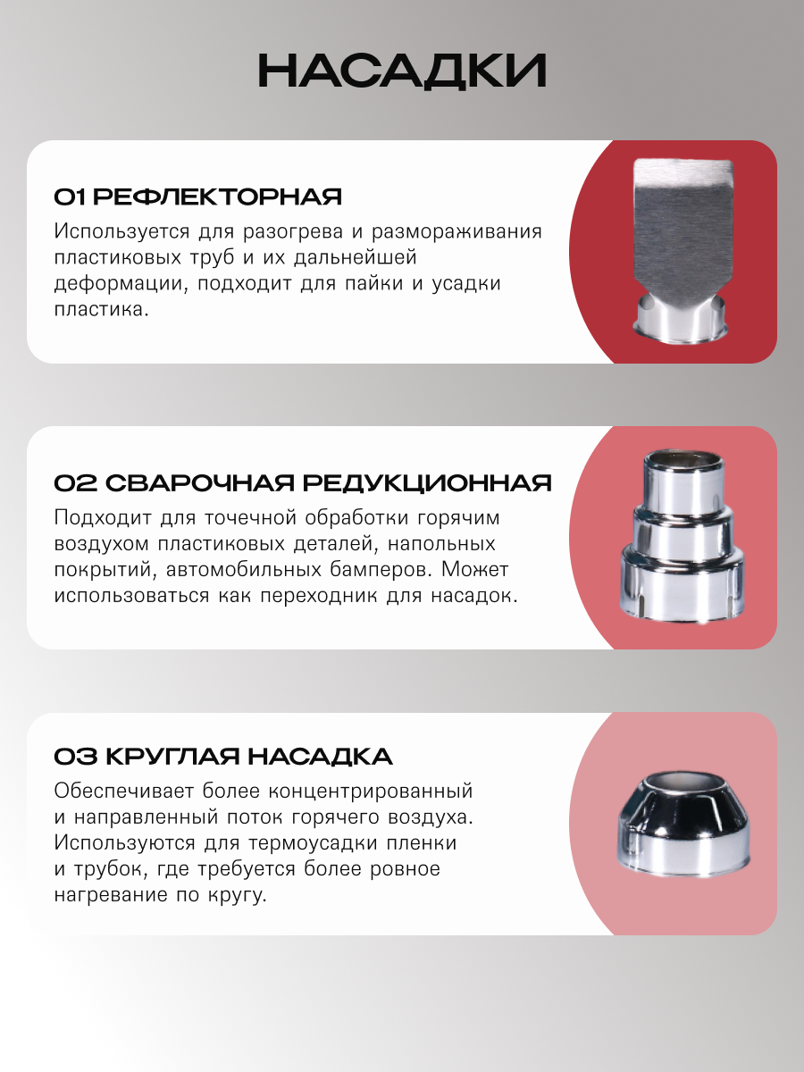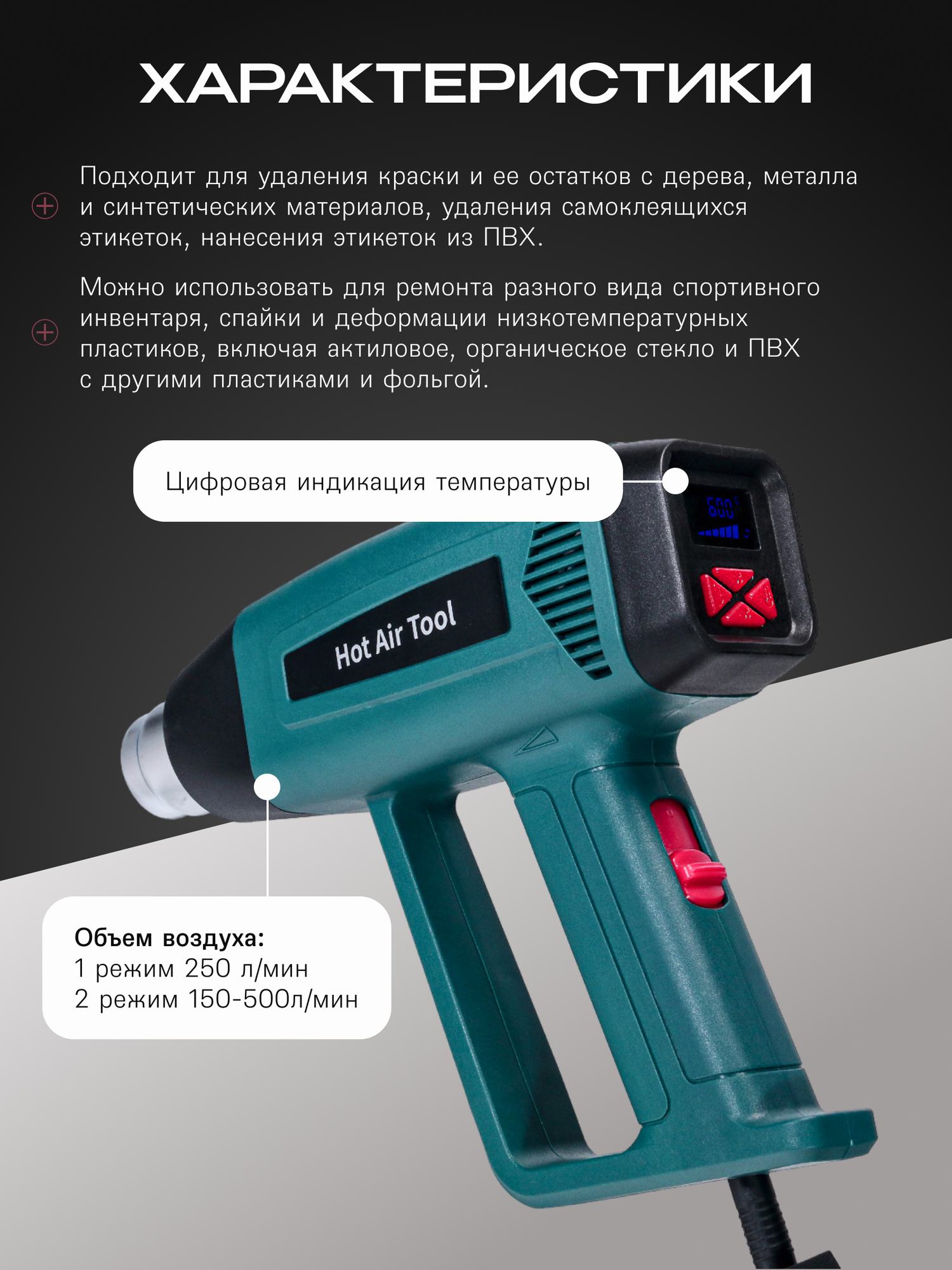 Термофен предназначен для следующих операций: Удаление краски или ее остатков с дерева, металла и синтетических материалов Для удаления самонлеящихся этикеток Нанесение этикеток из ПВХ Деформация низкотемпературных пластиков, включая акриловое и органическое стекло Спайка пластиков, в том числе ПВХ с другими пластиками и фольгой Усадочные рукава Комплектующие и отводы для труб отопления Ремонт лыж, досок для серфинга и аналогичного спортивного инвентаря