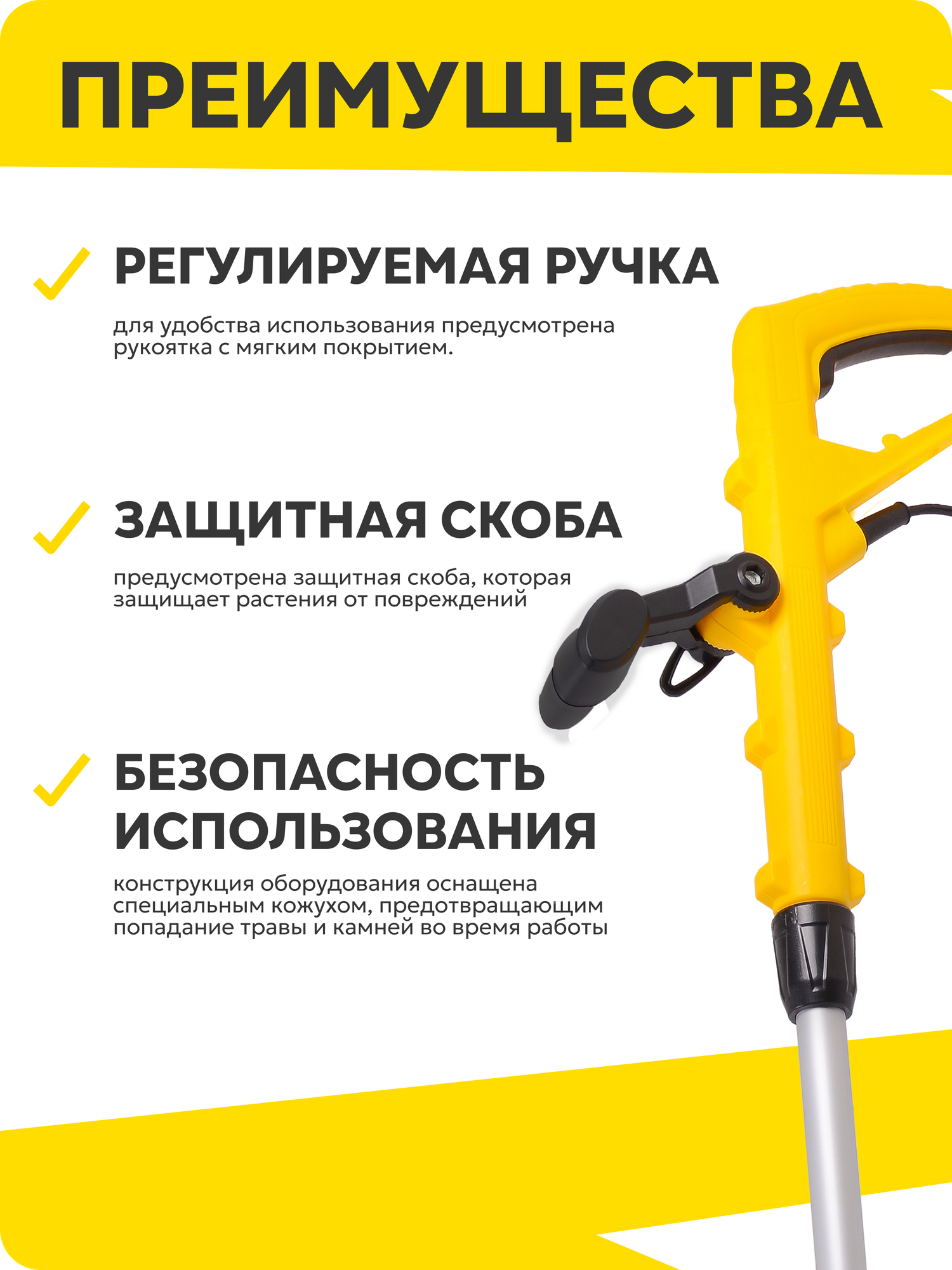 | Подробная комплектация | Штанга верхняя с мотором – 1 шт; Штанга нижняя – 1 шт; Режущий диск (в зависимости от модели) – 1 шт; Катушка с леской – 1 шт; Защитный кожух – 1 шт; Ремень наплечный (в зависимости от модели) – 1 шт; Рукоятка (в зависимости от модели) – 2 шт; Крепежный комплект (в зависимости от модели) – 1 шт; Комплект инструментов (в зависимости от модели) – 1 шт; Руководство по эксплуатации. |