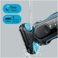 Электробритва Braun 51-M1000s Mint — модель сетчатого типа, оснащенная тремя плавающими головками. Они повторяют рельеф лица, что в сочетании с технологией Microcomb, направляющей волоски к режущим элементам, обеспечивает идеальный результат за один проход. Пластиковый корпус водонепроницаемый — бритву можно промывать под струей воды и использовать для влажного бритья. Рукоятка прорезинена и оснащена вставками с точечным рисунком, благодаря чему не скользит в ладони.