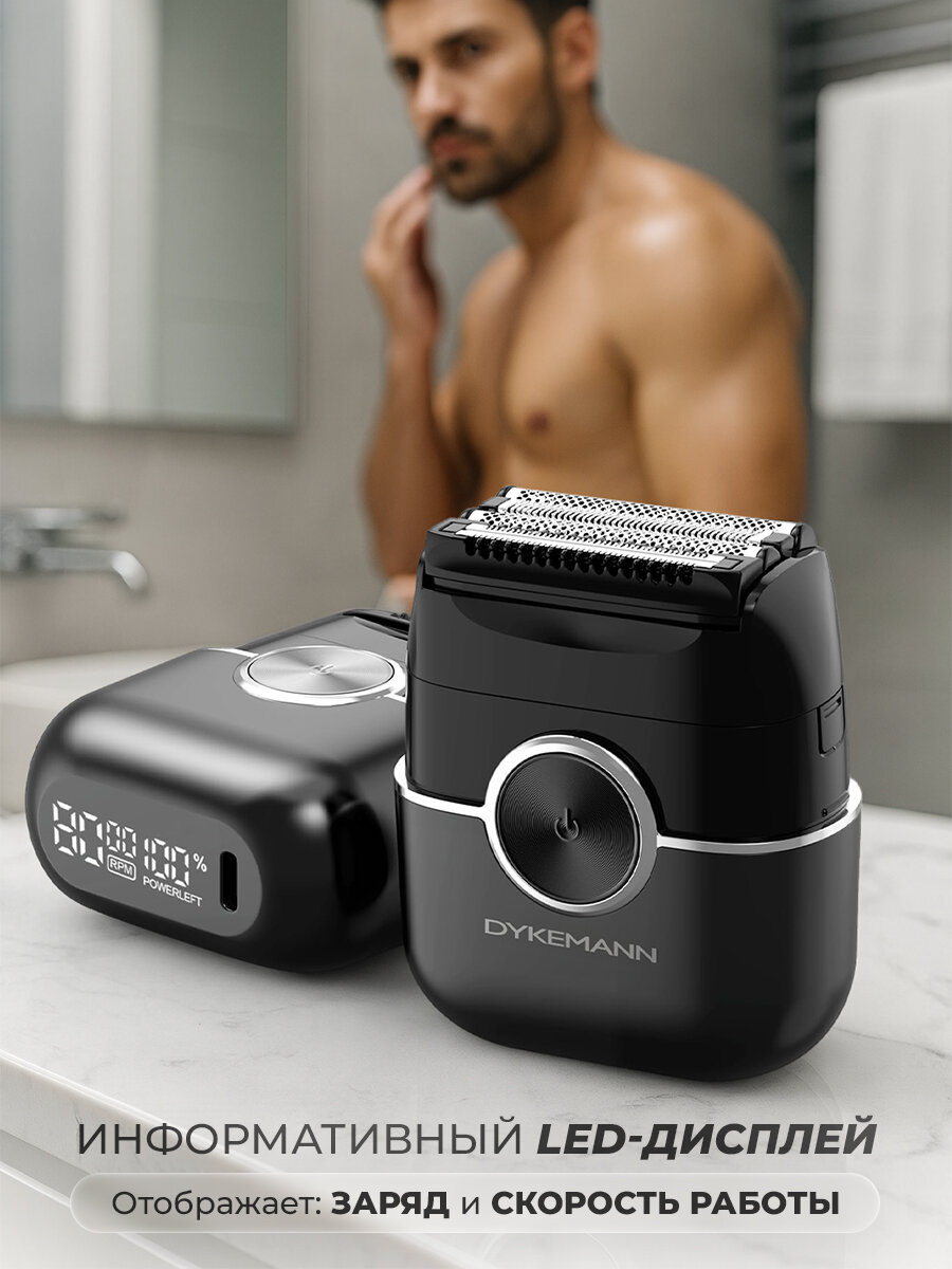 Электробритва DYKEMANN Bartfrei DL-13 сочетает в себе современные технологии и продуманный дизайн, обеспечивая максимально комфортное и чистое бритьё. Оснащённая инновационной 4D плавающей головкой, она точно адаптируется к контурам лица, легко подстраиваясь под линию подбородка, щёк и шеи. Бритва эффективно подстригает как короткую щетину, так и длинную бороду, оставляя кожу гладкой и без раздражения. Увеличенный LED-дисплей отображает всю необходимую информацию - уровень заряда, выбранную скорость работы и состояние блокировки. Благодаря встроенному аккумулятору элек-тробритва работает автономно, что делает её удобной как для ежедневного использования, так и для поездок. Функция дорожной блокировки предотвращает случайное включение в сумке или чемодане, а две скорости работы позволяют выбрать оптимальный режим для вашего типа кожи и густоты щетины. Бритва поддерживает сухое и влажное бритьё, что дает возможность использовать её как с пеной, так и без пены. Магнитное крепление защитной крышки обеспечивает надёжную защиту лезвий и удобство хранения. Благодаря компакт-ному размеру бритва не занимает много места в дорожной сумке и идеально подходит для использования дома, в командировках, в походах и путешествиях.