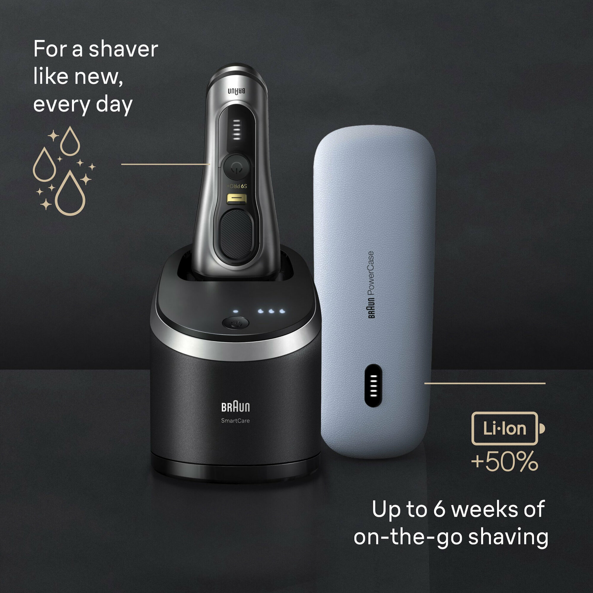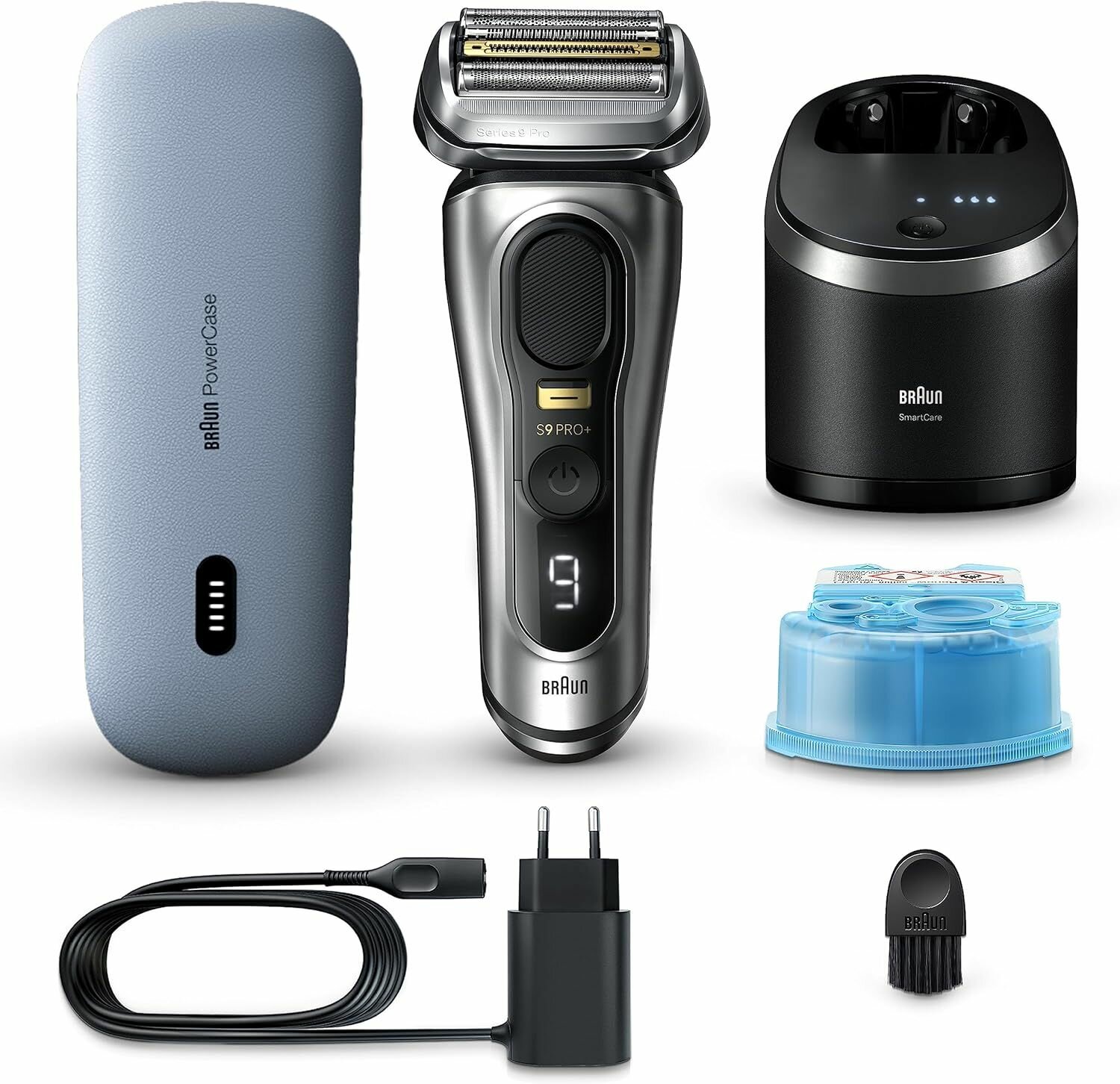 Электробритва Braun Series 9 Pro+, футляр PowerCase с возможностью подзарядки от встроенного аккумулятора, станция очистки и подзарядки SmartCare Center с картриджем, зарядное устройство, щеточка для чистки
