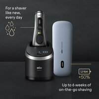 Электробритва Braun Series 9 Pro+ переосмысливает бритье - для чистого бритья с максимальным комфортом для кожи. С 5 специальными элементами ProShave, включая лезвие ProLift. Series 9 Pro+ обеспечивает эффективное и гладкое бритье при каждом движении, независимо от того, какая у вас борода - 1, 3 или 7 дней. Оцените предельную точность благодаря ProTrimmer с лезвиями из хирургической стали, которые эффективно захватывают даже длинные волосы, бакенбарды и усы. Изготовлен полностью в Германии и имеет долгий срок службы даже при ежедневном бритье, а также мощный литий-ионный аккумулятор с 60-минутным временем работы. Подходит для сухого и влажного бритья. В комплекте 2 аксессуара премиум-класса: станция для чистки 6 в 1, чтобы бритва была как новая каждый день, и чехол для зарядки бритвы (PowerCase) для 90 минут беспроводного бритья. В комплект поставки входит: 1x электробритва 1x станция 6-в-1 с чистящим картриджем 1x футляр для зарядки бритвы (PowerCase) 1x кабель для зарядки 1x щеточка для чистки