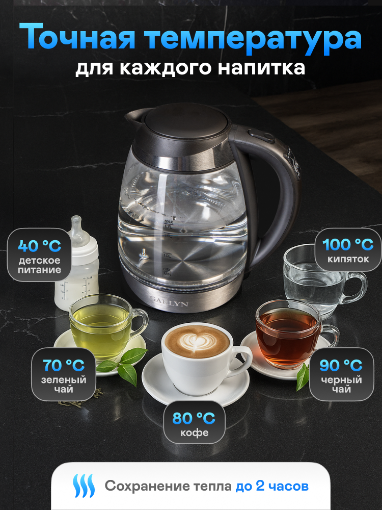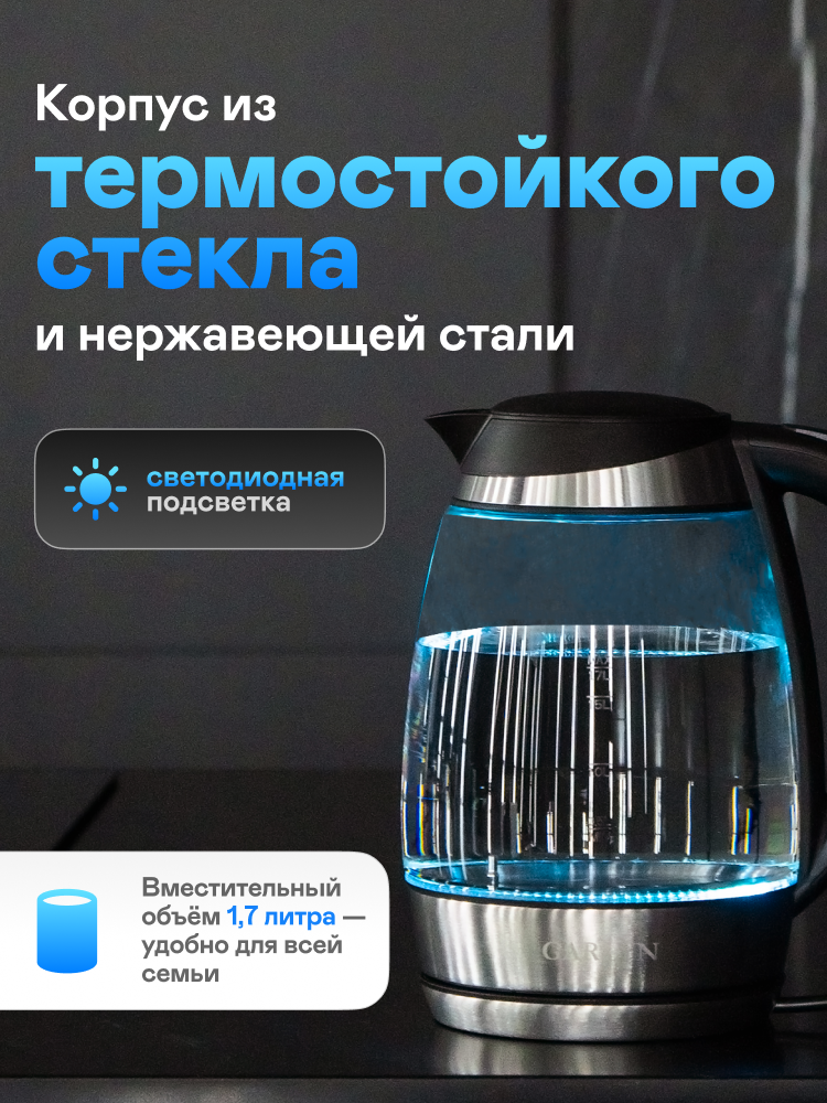 Электрочайник GARLYN K-310. С подсветкой. Объем 1,7 л. Поддержание температуры.: сравнение цен, характеристики, фото, актуальное наличие и цены.