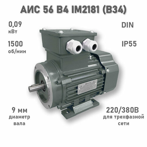Электродвигатели общепромышленные серии АИС предназначены для замены европейских и китайских импортных трехфазных электродвигателей, согласно стандарта DIN (CENELEC), таких, как: Siemens, ABB, WEG, GAMAK, Sew-Eurodrive и др. Электродвигатель АИС 56 В4 мощностью 0.09 кВт и номинальной частотой вращения 1300 об/мин имеет рабочее напряжение 220/380В±10%, рассчитан для работы от трехфазной сети переменного тока частотой 50Гц. Климатическое исполнение "У2", режим работы "S1", класс защиты "IP55", класс изоляции "F", метод охлаждения "IC411", класс энергоэффективности "IE1". Обмотка выполнена из высококачественной меди, а надежные подшипники имеют типоразмер (спереди/сзади) 6201 ZZ-C3 / 6201 ZZ-C3. Предусмотрено резьбовое отверстие в торце рабочего вала для дополнительной фиксации шестерни, шкива или различных муфт. Лапы электродвигателя демонтируются (съемные).