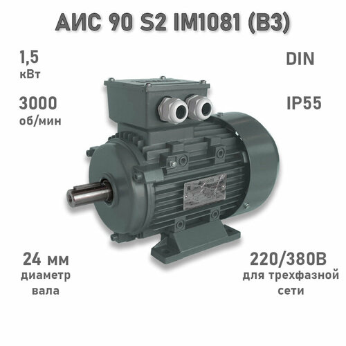 Электродвигатели общепромышленные серии АИС предназначены для замены европейских и китайских импортных трехфазных электродвигателей, согласно стандарта DIN (CENELEC), таких, как: Siemens, ABB, WEG, GAMAK, Sew-Eurodrive и др. Электродвигатель АИС 90 S2 мощностью 1.5 кВт и номинальной частотой вращения 2850 об/мин имеет рабочее напряжение 220/380В±10%, рассчитан для работы от трехфазной сети переменного тока частотой 50Гц. Климатическое исполнение "У2", режим работы "S1", класс защиты "IP55", класс изоляции "F", метод охлаждения "IC411", класс энергоэффективности "IE1". Обмотка выполнена из высококачественной меди, а надежные подшипники имеют типоразмер (спереди/сзади) 6205 ZZ-C3 / 6205 ZZ-C3. Предусмотрено резьбовое отверстие в торце рабочего вала для дополнительной фиксации шестерни, шкива или различных муфт. Лапы электродвигателя переставные, что обеспечивает возможность подвода питания как сверху, так и сбоку, а при необходимости - лапы демонтируются (съемные).