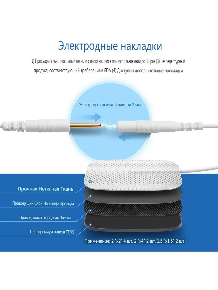 Гипоаллергенные гелевые электроды для массажеров и миостимуляторов использующих электростимуляцию (EMS) и электронейростимуляцию (TENS). Самоклеящиеся многоразовые гелевые электроды для миостимуляторов массажера со шнуром подходят к массажерам с разъемом 2 мм (папа).