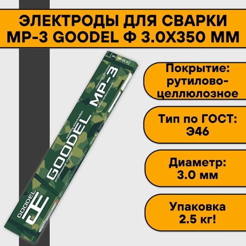 Сварочные электроды GOODEL МР-3 ф 3.0х350 мм (2.5 кг) с рутилово-целлюлозным покрытием предназначены для ручной дуговой сварки ответственных конструкций из углеродистых и низколегированных сталей, с временным сопротивлением разрыву до 500 МПа, когда к получаемым швам предъявляются повышенные требования.