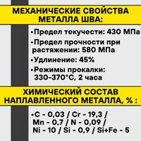 Тип покрытия - кисло-рутиловое. Электрод общетехнического назначения для сварки изделий, эксплуатирующихся при температурах до 400°С из коррозионностойких хромоникелевых сталей марок 03Х18Н10, 08Х18Н10Т, AISI 304L, 321, 347 и им подобных, когда к металлу шва предъявляются жесткие требования по стойкости к межкристаллитной коррозии. Электрод характеризуется великолепными сварочно-технологическими свойствами, минимальным количеством брызг и отличной отделяемостью шлака. Содержание ферритной фазы в наплавленном металле в исходном после сварки состоянии составляет 1,5…6% (FN 3-10). Ток: ~ / = (+). Пространственные положения при сварке: 1, 2, 3, 4, 6. Напряжение холостого хода: 50 В. Режимы прокалки: 330-370°С, 2 часа. МЕХАНИЧЕСКИЕ СВОЙСТВА: Предел прочности при растяжении - 580 МПа. Предел текучести - 430 МПа. Удлинение - 45% ХИМИЧЕСКИЙ СОСТАВ: C - 0,03 / Cr - 19,3 / Mn - 0,7 / N - 0,09 / Ni - 10 / Si - 0,9 / Si+Fe - 5