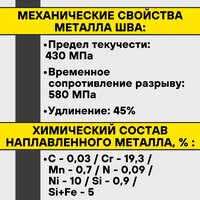 Тип покрытия - кисло-рутиловое. Электрод общетехнического назначения для сварки изделий, эксплуатирующихся при температурах до 400°С из коррозионностойких хромоникелевых сталей марок 03Х18Н10, 08Х18Н10Т, AISI 304L, 321, 347 и им подобных, когда к металлу шва предъявляются жесткие требования по стойкости к межкристаллитной коррозии. Электрод характеризуется великолепными сварочно-технологическими свойствами, минимальным количеством брызг и отличной отделяемостью шлака. Содержание ферритной фазы в наплавленном металле в исходном после сварки состоянии составляет 1,5…6% (FN 3-10). Ток: ~ / = (+). Пространственные положения при сварке: 1, 2, 3, 4, 6. Напряжение холостого хода: 50 В. Режимы прокалки: 330-370°С, 2 часа. МЕХАНИЧЕСКИЕ СВОЙСТВА: Предел прочности при растяжении - 580 МПа. Предел текучести - 430 МПа. Удлинение - 45% ХИМИЧЕСКИЙ СОСТАВ: C - 0,03 / Cr - 19,3 / Mn - 0,7 / N - 0,09 / Ni - 10 / Si - 0,9 / Si+Fe - 5