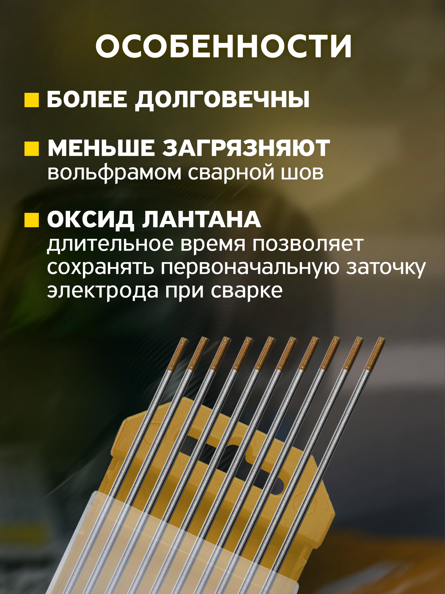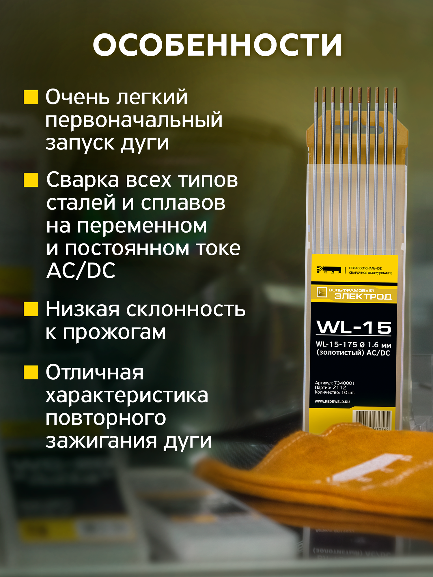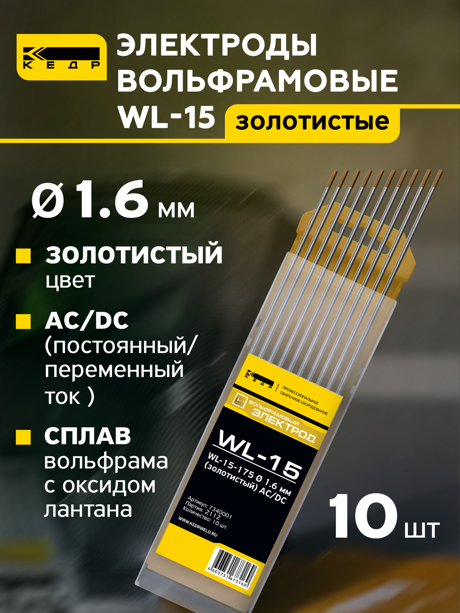 Купить Электроды вольфрамовые кедр WL-15 диаметр 1,6 (Золотой) для аргонодуговой сварки (10шт.) 7340002 с доставкой по всей России. Электроды вольфрамовые кедр WL-15 диаметр 1,6 (Золотой) для аргонодуговой сварки (10шт.) 7340002: сравнение цен, характеристики, фото, актуальное наличие и цены.