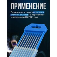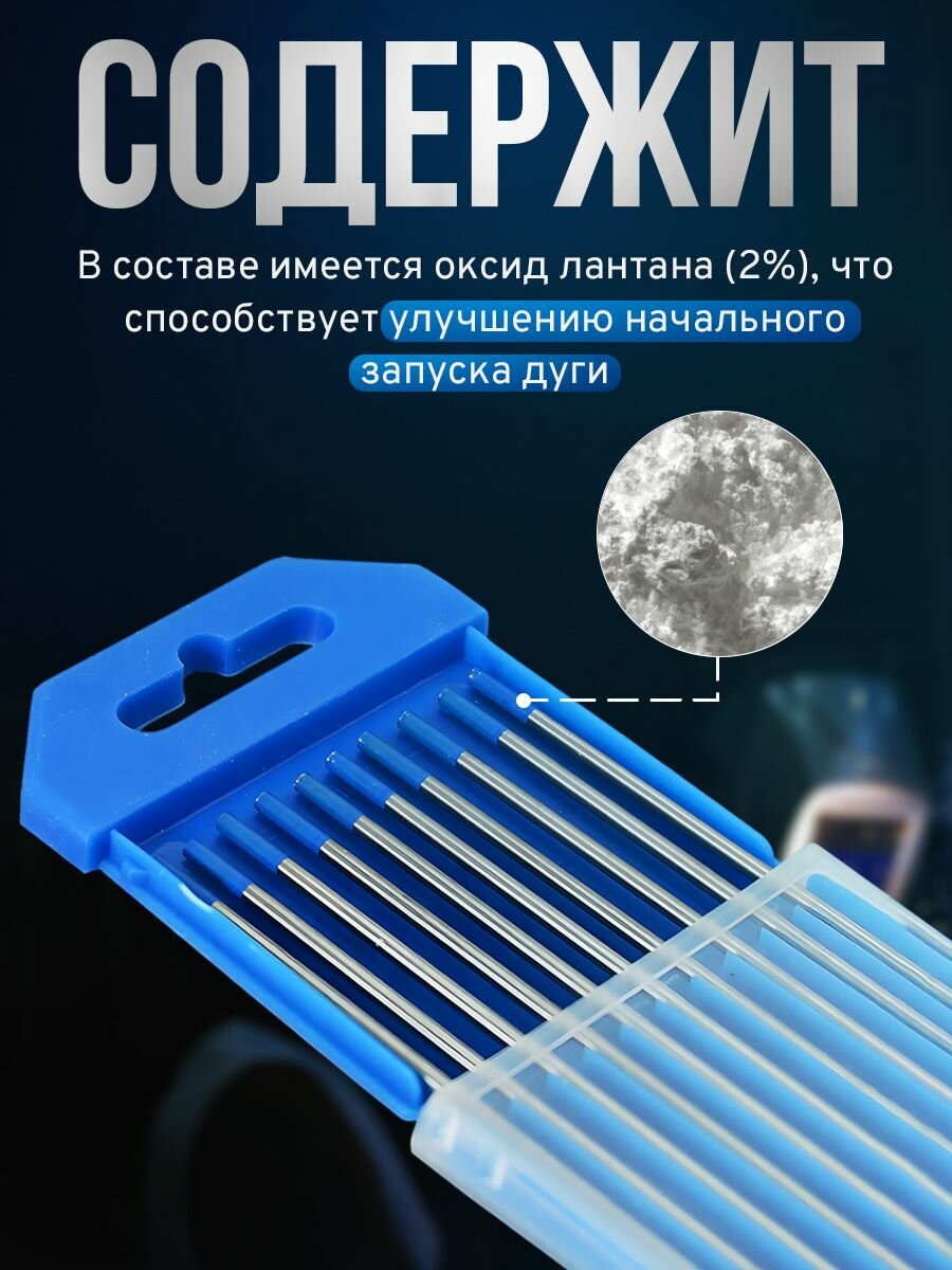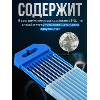 Универсальные вольфрамовые электроды WL-20 -175, сварка всех типов сталей и сплавов на переменном (AC) и постоянном токе (DC). Электроды из сплава вольфрама с оксидом лантана WL-20 имеют очень легкий первоначальный поджиг дуги, низкую склонность к прожогам, устойчивую дугу и отличную характеристику повторного зажигания дуги. Добавление 2,0% оксида лантана увеличивает максимальный ток, несущая способность электрода примерно на 50% больше для данного типоразмера при сварке на переменном токе, чем чисто вольфрамового. По сравнению с цериевыми и ториевыми, лантановые электроды имеют меньший износ рабочего конца электрода. Лантановые электроды более долговечны и меньше загрязняют вольфрамом сварной шов. Оксид лантана равномерно распределен по длине электрода, что позволяет длительное время сохранять при сварке первоначальную заточку электрода. Это серьезное преимущество при сварке на постоянном (прямой полярности) или переменном токе от улучшенных источников сварочного тока, сталей и нержавеющих сталей. При сварке на переменном синусоидальном токе рабочий конец электрода должен иметь сферическую форму.