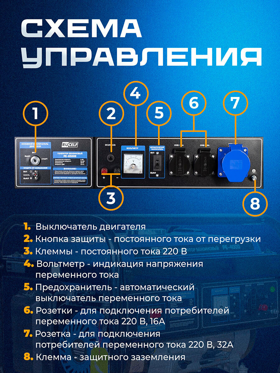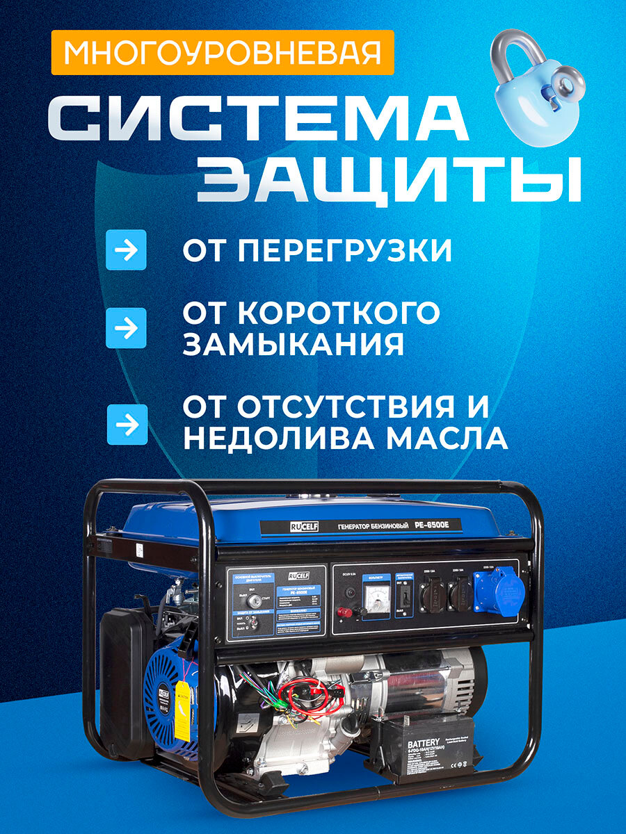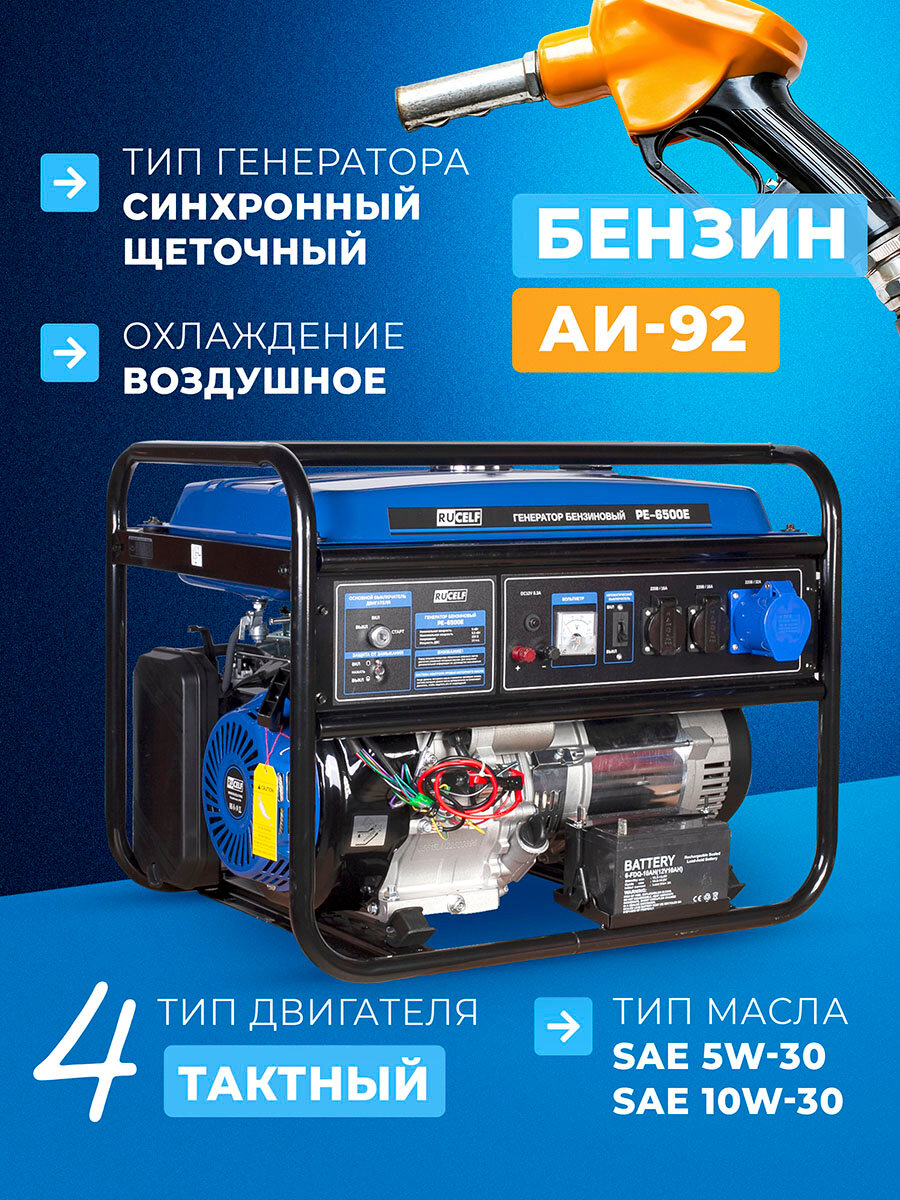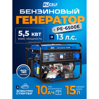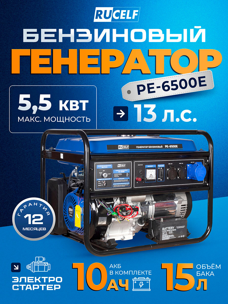 Электрогенератор бензиновый RUCELF PE-6500E, электростартер с АКБ, медь, 5,5 КВт, силовой разъем: сравнение цен, характеристики, фото, актуальное наличие и цены.