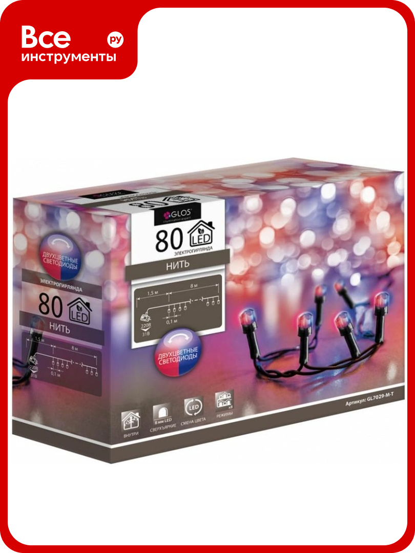 Электрогирлянда GLOS «Нить», 8 м, 80 сверхъярких двухцветных матовых светодиодов (красный + синий) GL7029-M-Т: сравнение цен, характеристики, фото, актуальное наличие и цены.