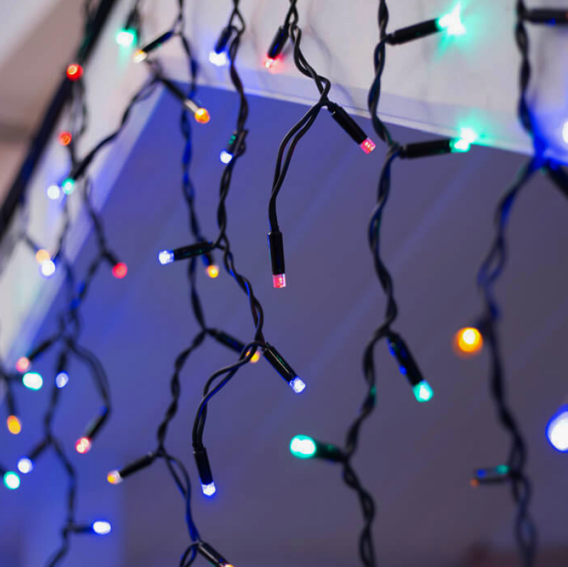 Купить Электрогирлянда уличная Бахрома 20м / Гирлянда светодиодная, питание от сети 220В, черный провод, разноцветный свет с доставкой по всей России.