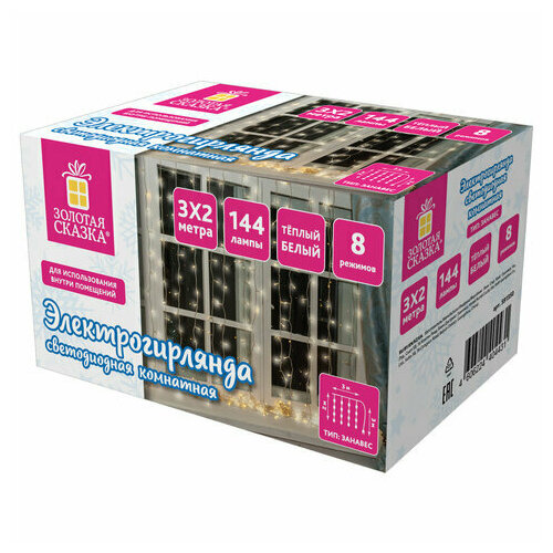Электрогирлянда типа "Штора" - один из самых популярных сейчас видов гирлянд. Мягкий и вместе с тем насыщенный свет этих украшений позволяет использовать их для создания уютного свечения внутри помещений. Название товара: Электрогирлянда-занавес комнатная "Штора" 3х2 м, 144 LED, теплый белый свет, 220 V, золотая сказка, 591350. Артикул производителя/код товара: 591350 Бренд: золотая сказка