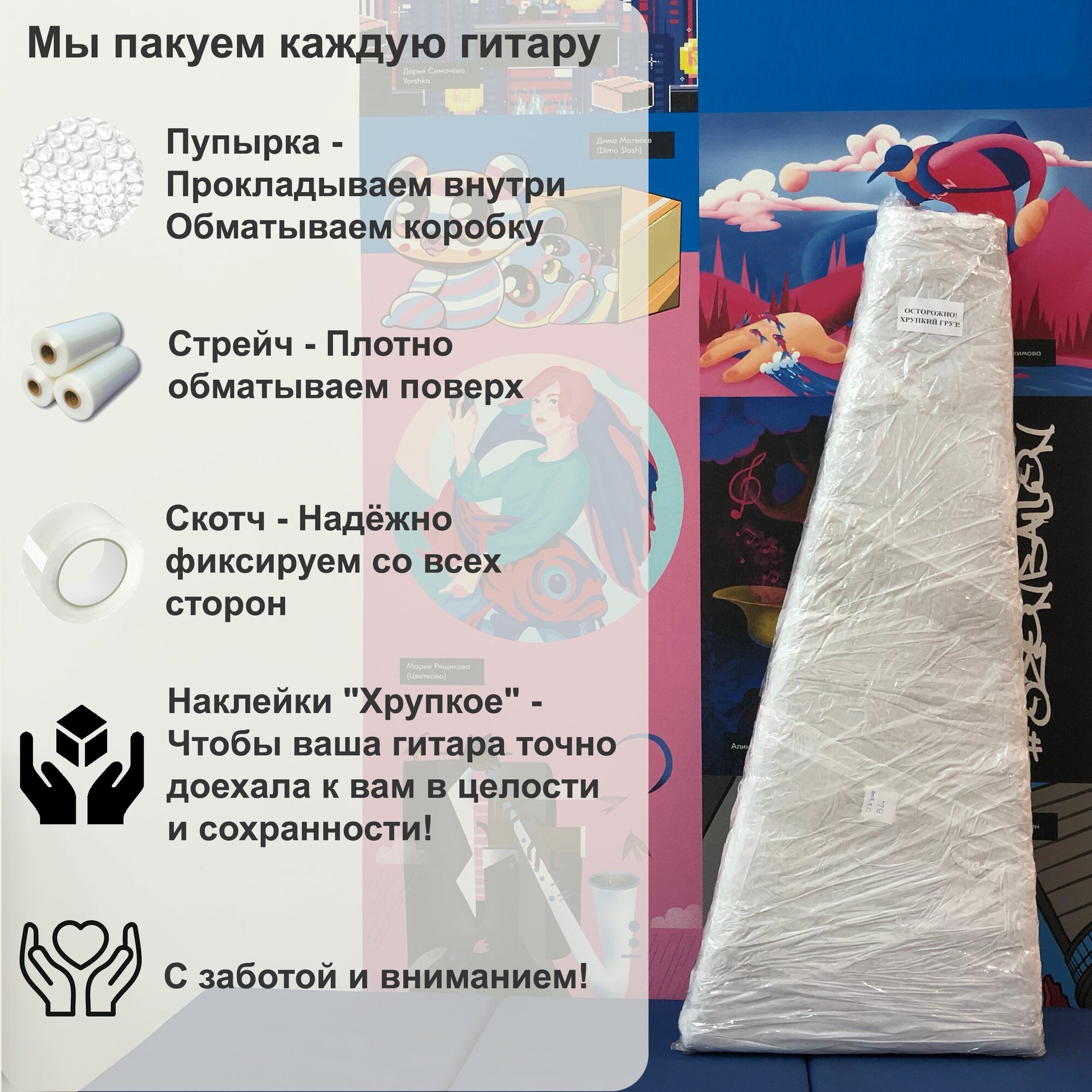 Каждую электрогитару мы прокладываем внутри коробки дополнительным мягким наполнителем, а саму коробку с электрогитарой мы аккуратно заворачиваем в воздушно-пузырчатую плёнку, стрейч-плёнку и клейкую ленту, клеим на упаковку наклейки "Хрупкий груз". Чтобы ваша гитара точно доехала к вам в целости и сохранности!