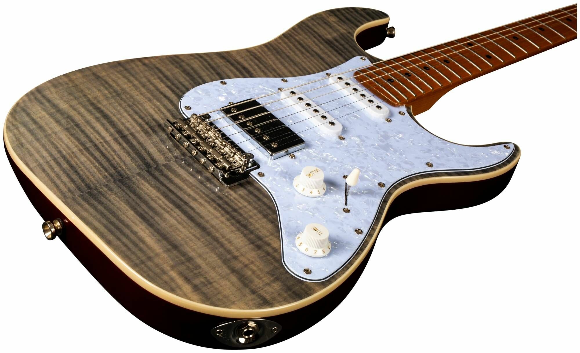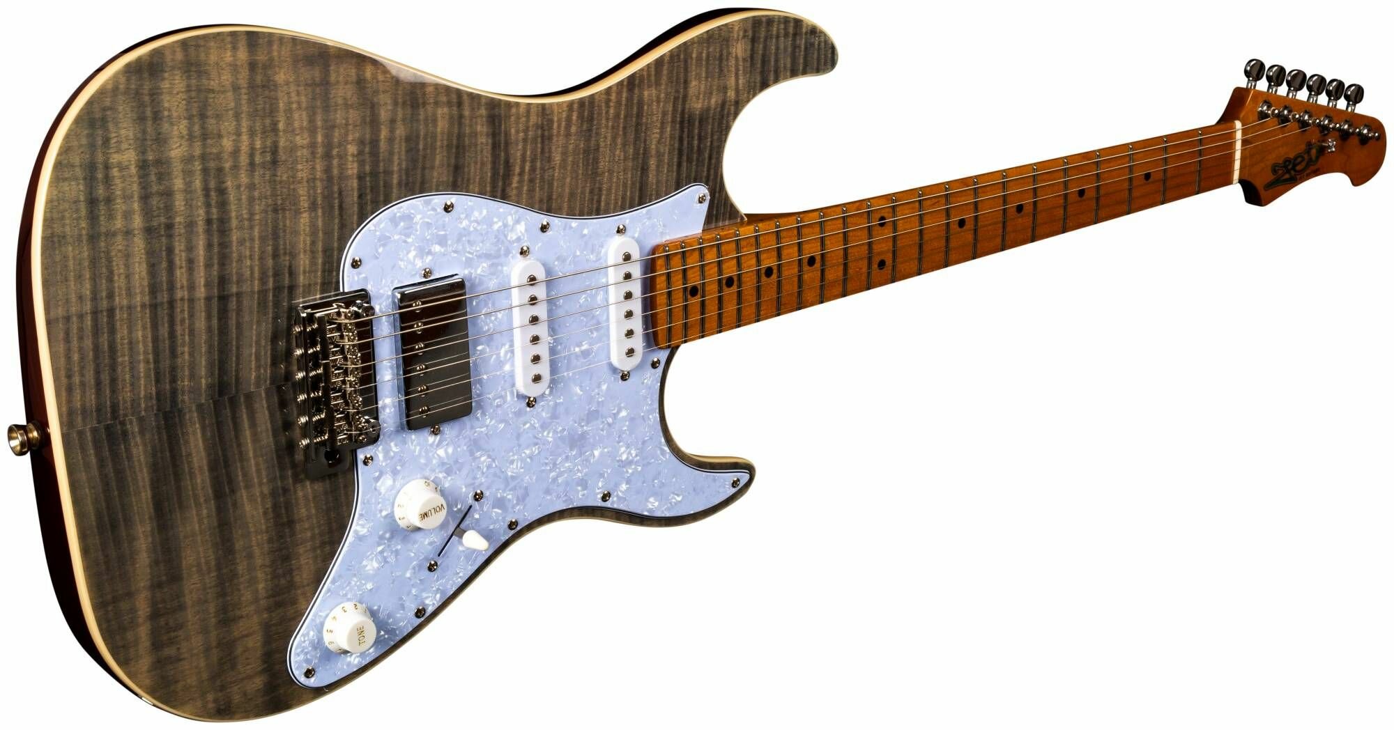 Гриф и накладка на гриф выполнены из печеного клена (roasted maple). При такой обработке поры дерева максимально сжимаются и в процессе использования вода уже не будет выходить, ваша накладка не сожмется и лады не повылазят вне зависимости от влажности и смены температуры. Плюс такое дерево выглядит очень красиво.