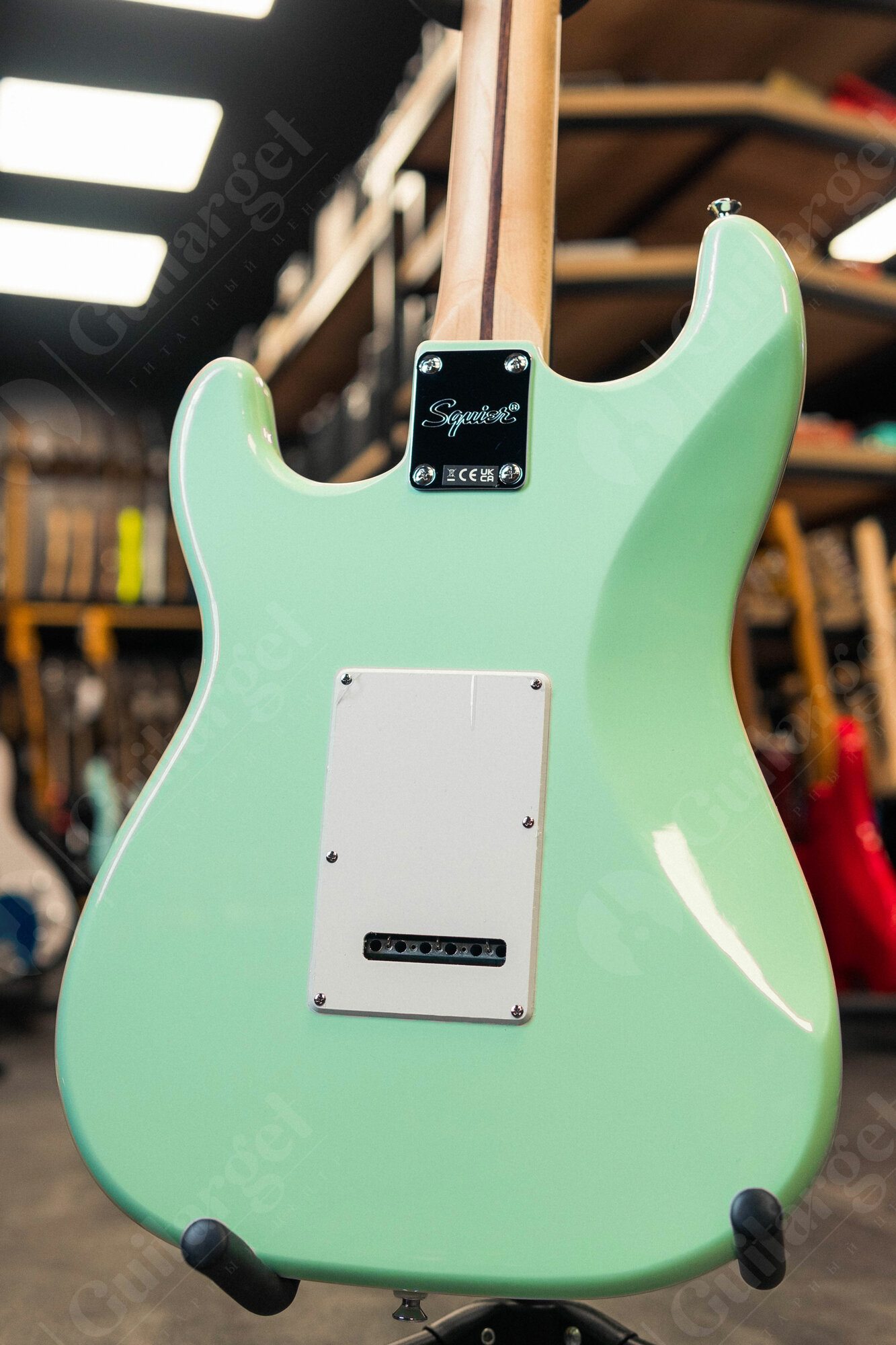 FENDER SQUIER AFFINITY SERIES STRATOCASTER LAUREL FINGERBOARD SURF GREEN – стратокастер из линейки Affinity Series. Гитара обладает прекрасным звуком, стильным узнаваемым внешним видом, удобна при игре и представляет собой отличное сочетание цены и качества. Корпус гитары выполнен из ольхи с полиуретановым покрытием. Гриф – кленовый, профиля «С», также с полиуретановой отделкой. Мензура – 25,5’’, на грифе 21 лад Medium Jumbo. Накладка на гриф представленной модели - из терминалии с инкрустацией перламутровыми точками. За звук отвечают три сингла Standard Single-Coil Strat. Настройка звука осуществляется пятипозиционным переключателем звукоснимателей, двумя регуляторами тембра и одним регулятором громкости. Тремоло Vintage-Style предоставляет широкие возможности для импровизации. Модель доступна в нескольких эффектных вариантах цветового исполнения. Представленная гитара – эффектного цвета морской волны с контрастным однослойным белым пикгардом и блестящей хромированной фурнитурой.
