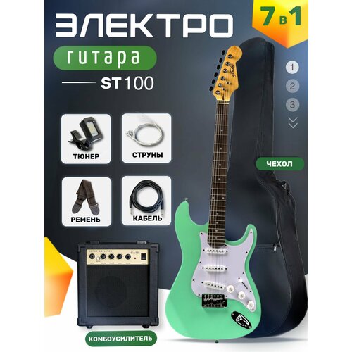 Купить Электрогитара Stratocaster Ментоловая Fabio ST100 MENTOL MATT S-S-S, 1V+2T (Набор электрогитары с комбоусилитем) с доставкой по всей России.