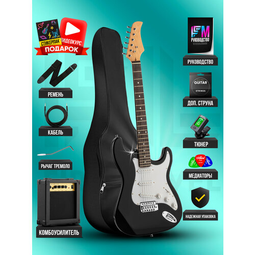 Купить Электрогитара Stratocaster с комплектом PREMIUM, черная с доставкой по всей России.