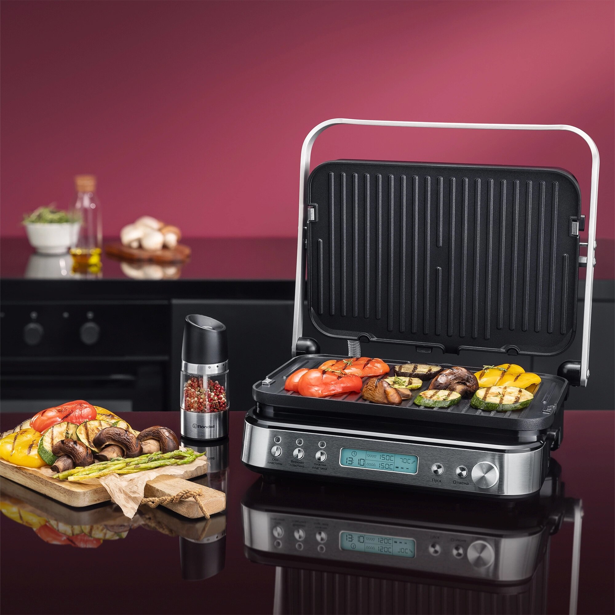Электрогриль Rondell RDE-1702 2200Вт серебристый, Информационный дисплей, Антипригарное покрытие нагревательных частей: сравнение цен, характеристики, фото, актуальное наличие и цены.