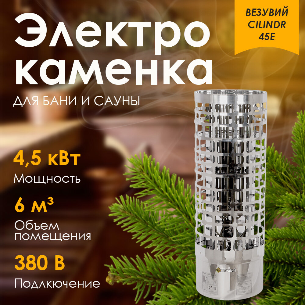 Электрокаменка Везувий CILINDR 45E, 4.5кВт, 6м³, напольная, островная, серебристая: сравнение цен, характеристики, фото, актуальное наличие и цены.