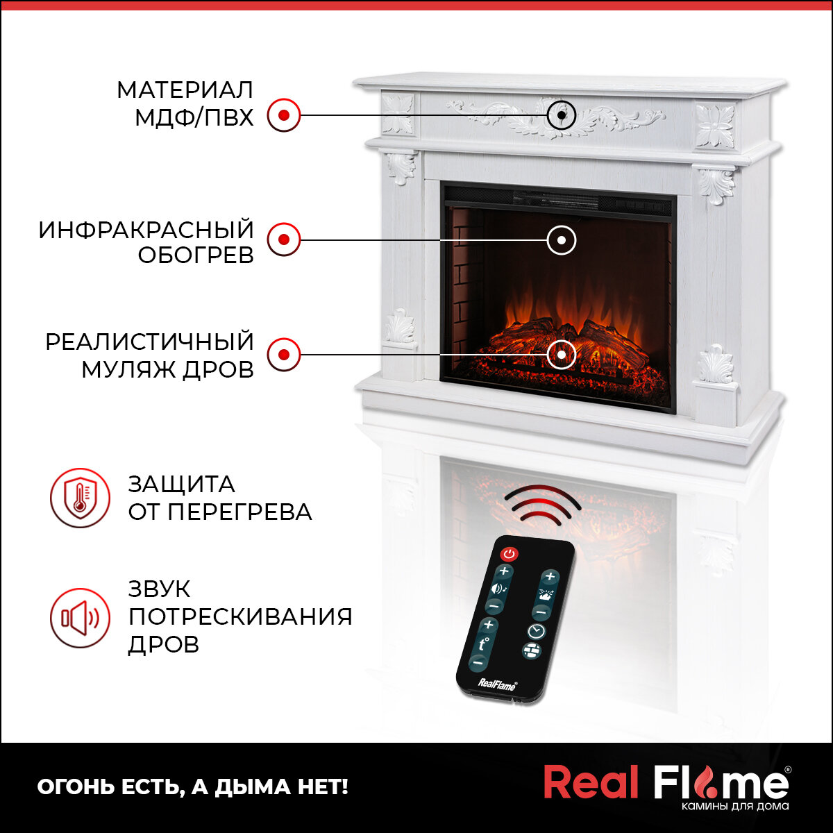 автоотключение, дистанционное управление, защита от перегрева, работа от сети, эффект живого огня