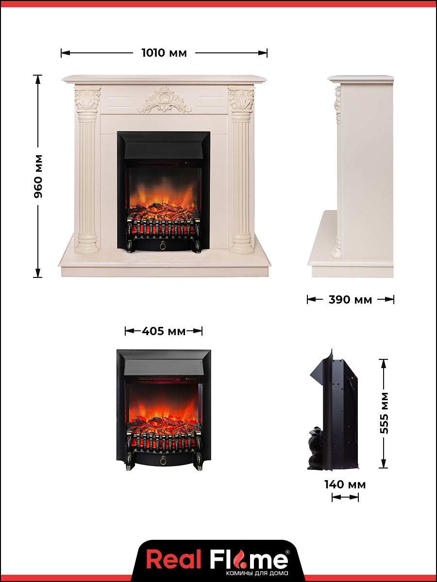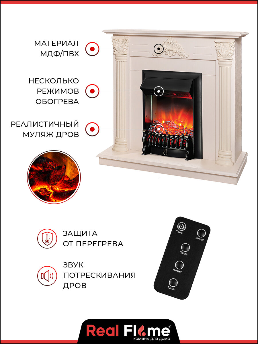 Компактное обрамление электрокамина RealFlame Stefania WT айвори с Fobos s Lux BL по бокам украшают объемные колонны, которые прекрасно сочетаются с центральным растительным декором. Материал портала: МДФ Цвет: слоновая кость (Айвори) Тип электрокамина: пристенный Стиль каминокомлпекта: классика Вид транспортировки: разобранный Мощность обогрева: до 1,5 кВт Регулировка мощности обогрева Защита от перегрева Звук потрескивания дров Лампы накаливания