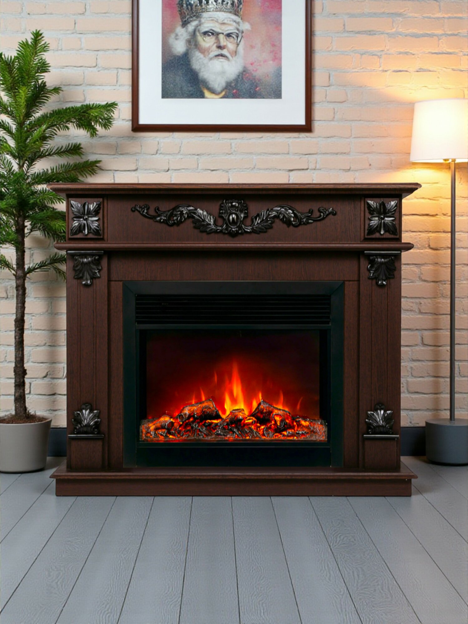 Электрокамин RealFlame Верона 26 коричневый МДФ с Helios 26 3D, имитация живого пламени 3D, обогрев, звуковой эффект